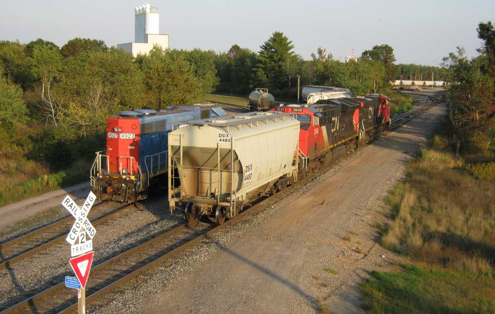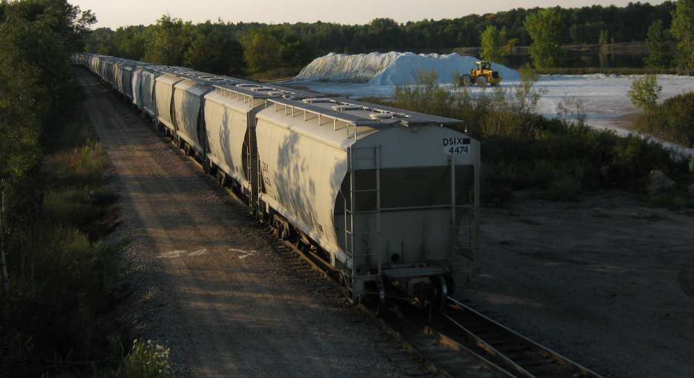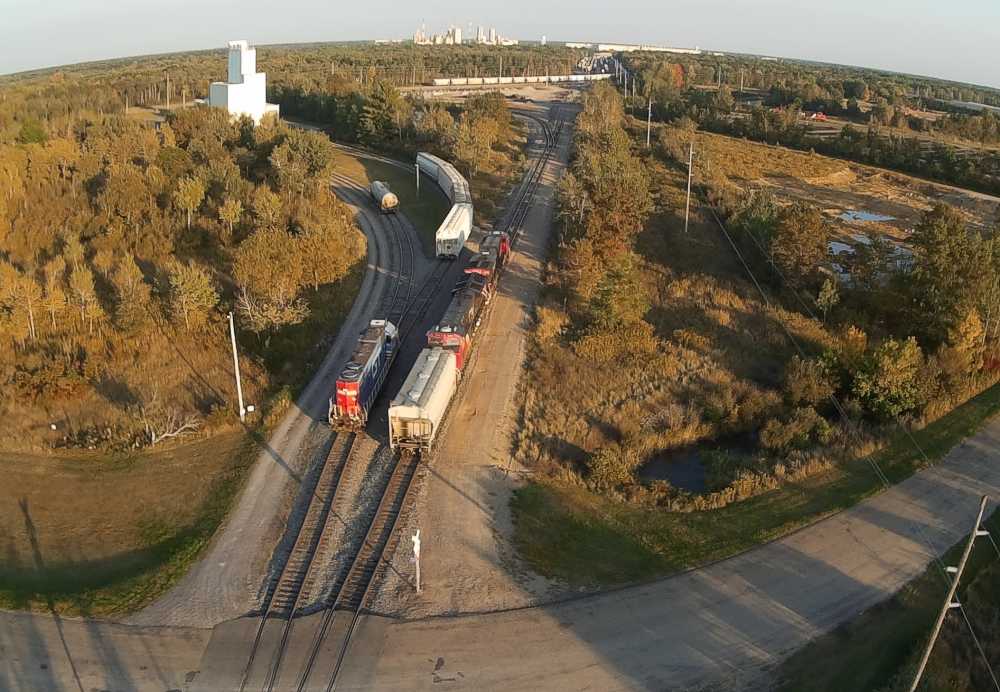 It can get crowded in Wisconsin Rapids. The yard only has 8 tracks. One sand train is parked on the west tail of the wye, split for the crossing. |