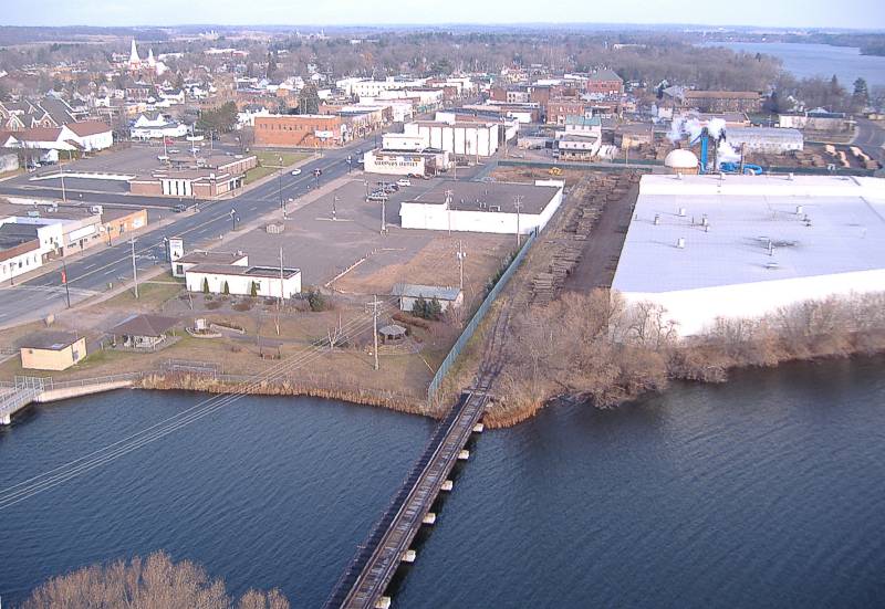 Big building is Birchwood Manufacturing (Besse Forest Products) This is on a spur from the main line that is a quarter mile to the west. Spur trestle crosses the Red Cedar River where it comes from Rice Lake. |