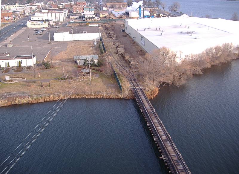 Farmers market parking lot, white tourist information building, and a historic display are north of the river; on the left of the picture.