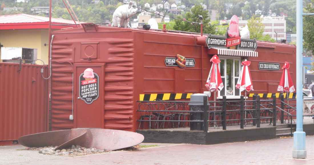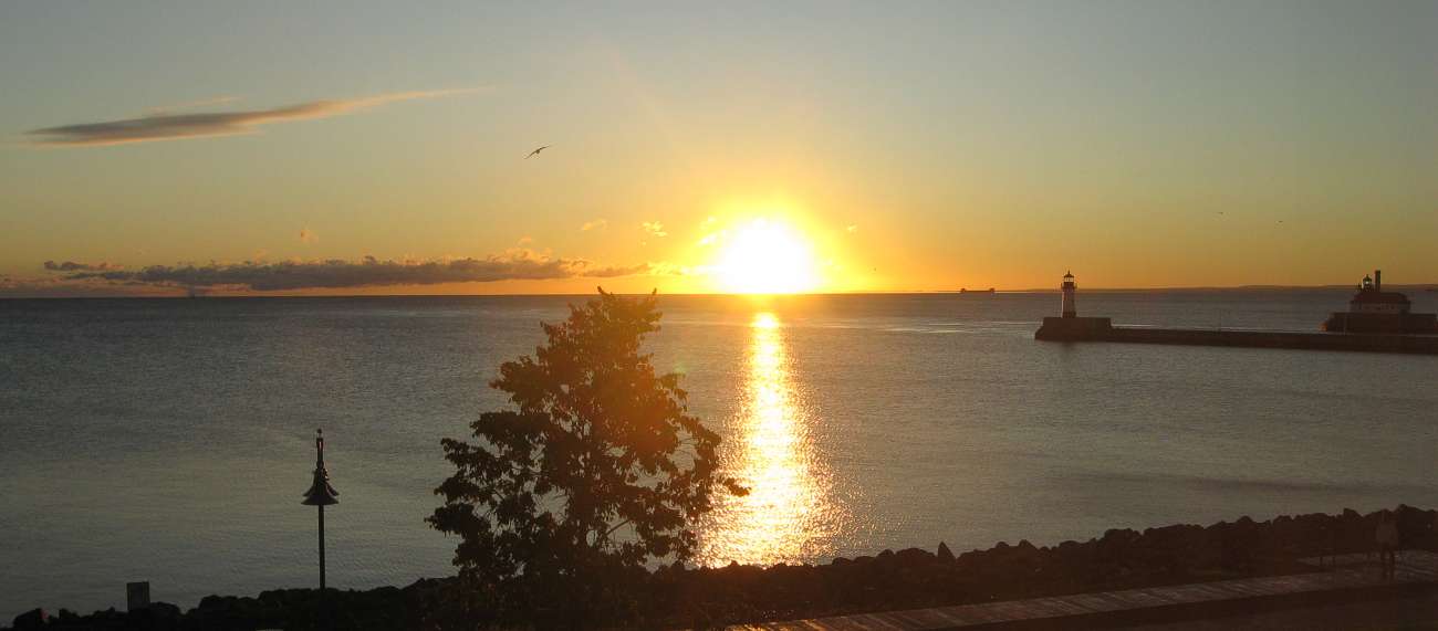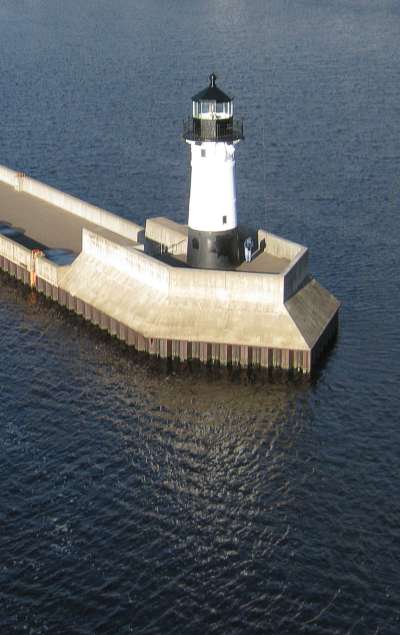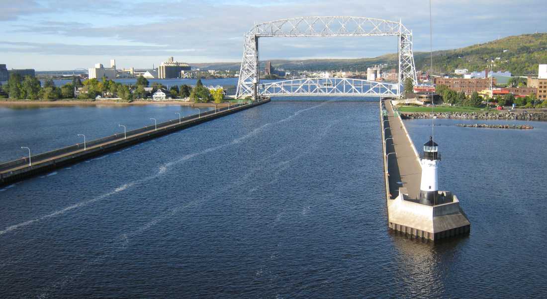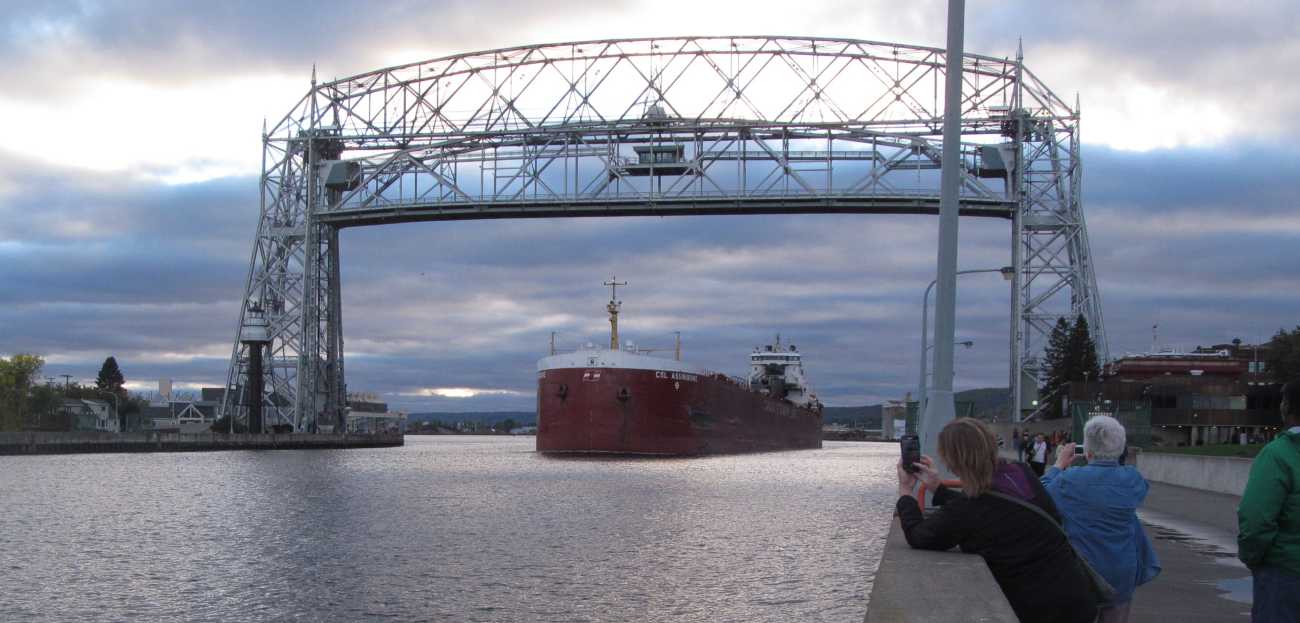 To the right of the canal is a bronze semi-round building, the Lake Superior Maritime Visitor Center