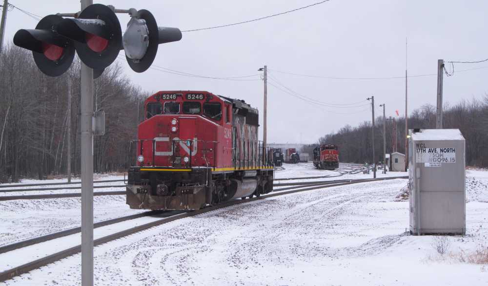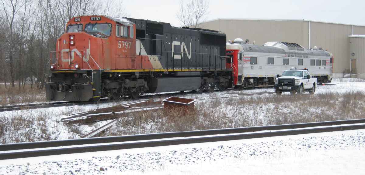 The inspection car CN 1501 overnighted in town. I would expect to see this Budd car by itself, not with a locomotive. |