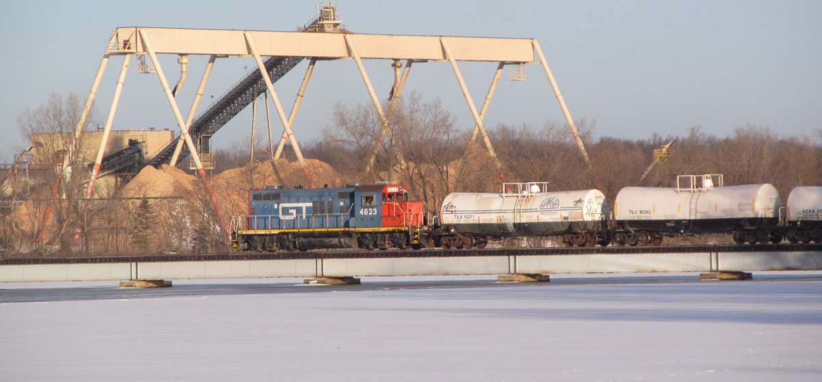 A blue G9R is on the local paper mill job this month. (a GTW GP40 is on the Plover turn, 10 miles away) Clay is pulled from storage on the east side of the Wisconsin River. I never learned if clay slurry freezes. Or if it just flows very slowly in this weather. |