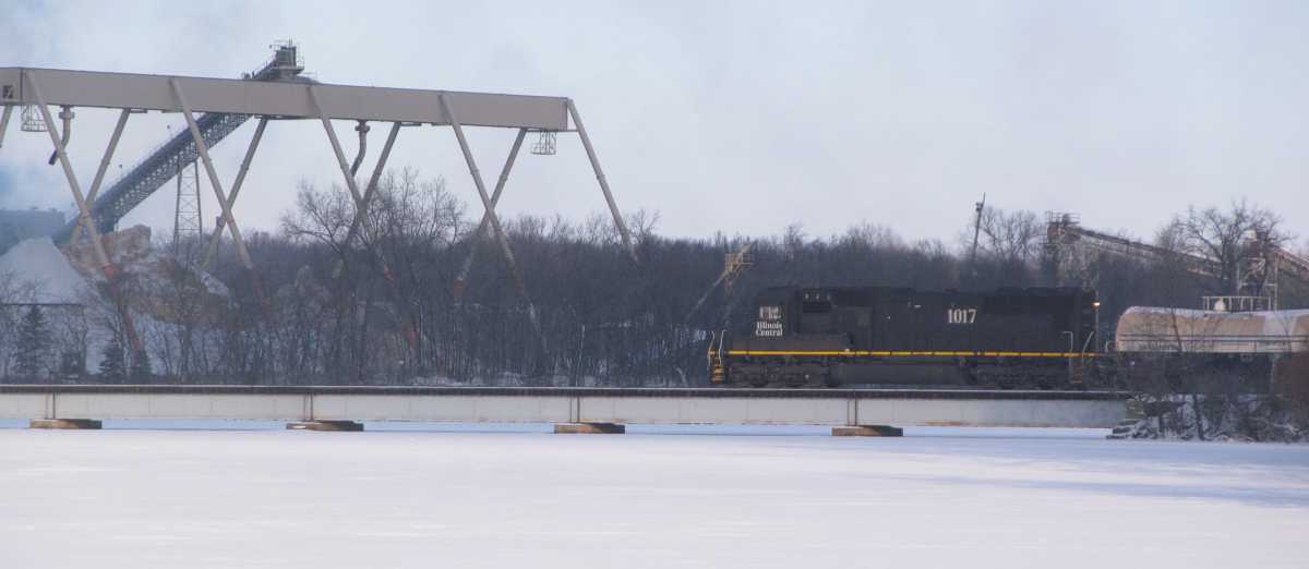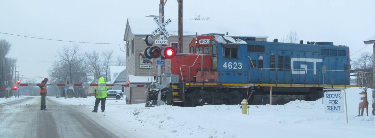 The crew gets off the engine and watches as the wheels creep over a frozen crossing at First Street. Wouldn't want a derailment from ice. |