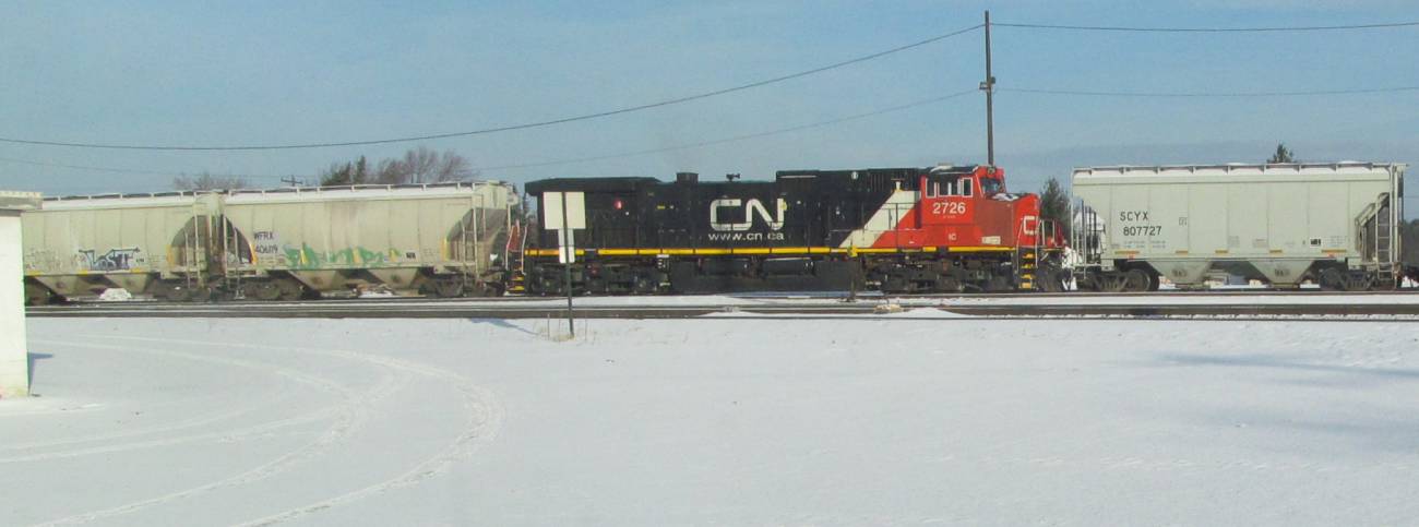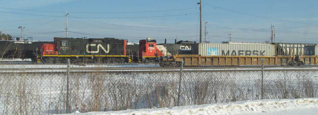 | A February westbound over the Plover River and Green Trail on the east end of the Point yard. |