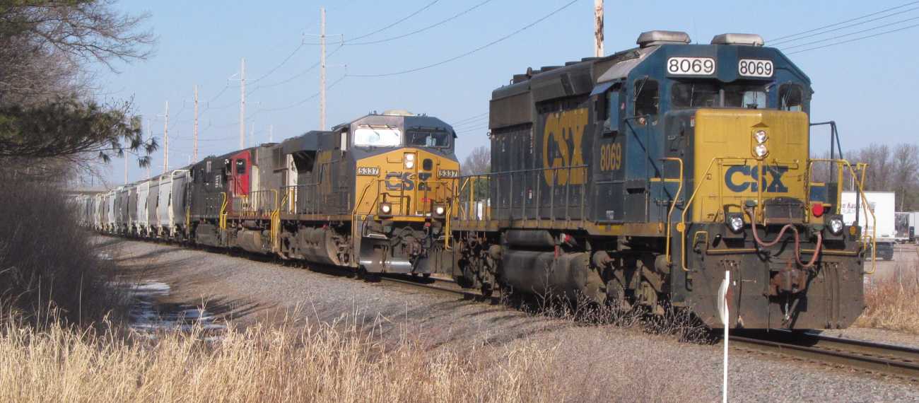 And on another morning at 25th Avenue, an interesing combination is being assembled onto an eastbound loaded sand train. Is that a GP-40 being added up front? But the number series say CSX 8069 is an SD-40. Still, that's small compared to most for a sand train. And I was too far away to see the number on the silver locomotive, further back. |