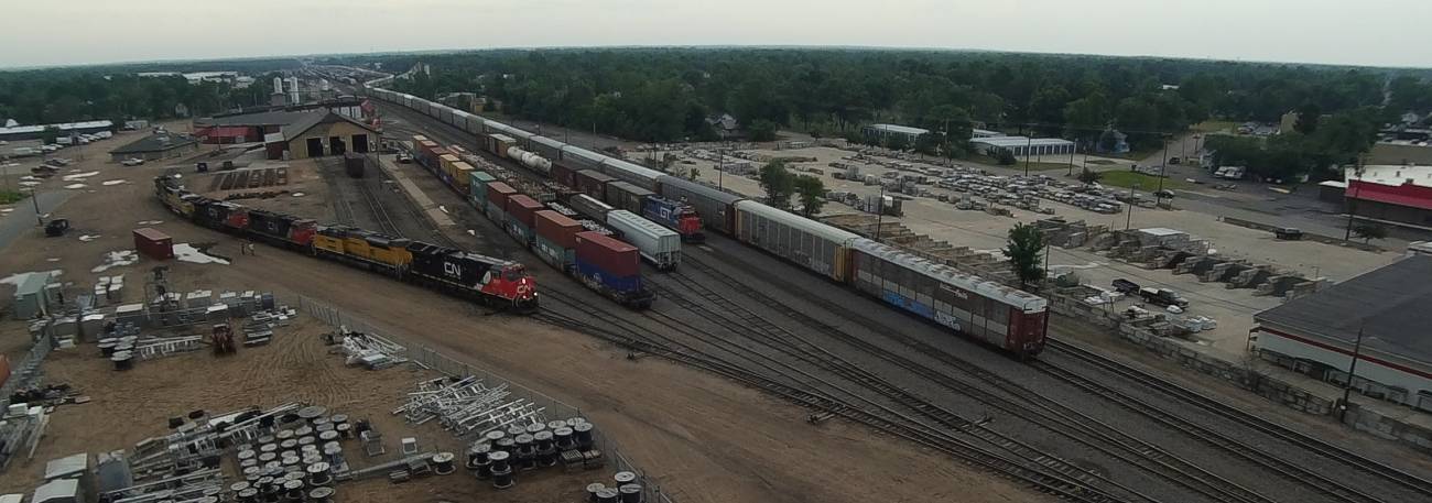 And they back into the car shops. Which was an opportunity to put up the quad for a picture just above tree top level, as seen from the Soo 2713 steam locomotive park. |