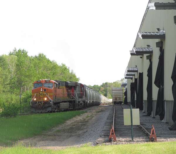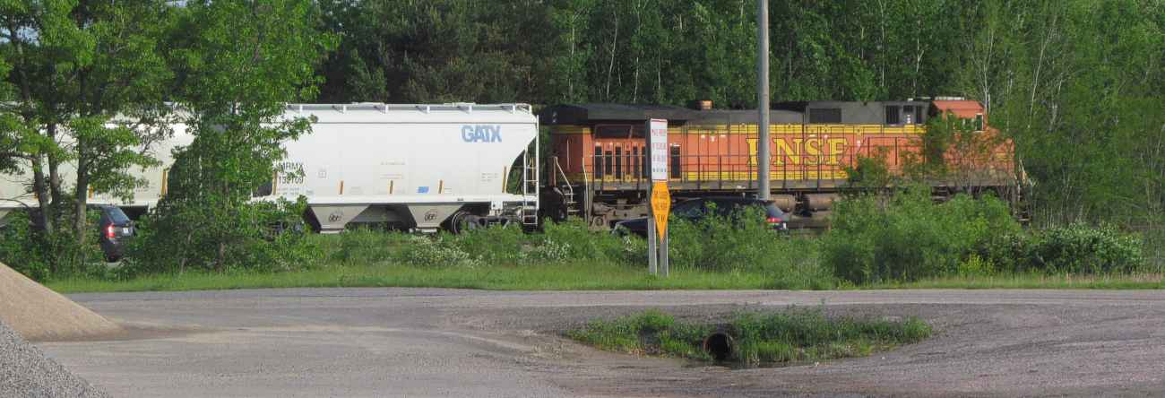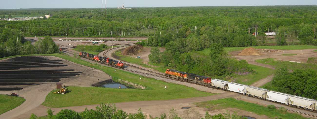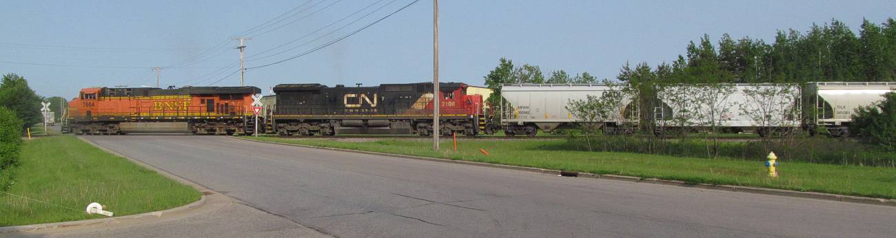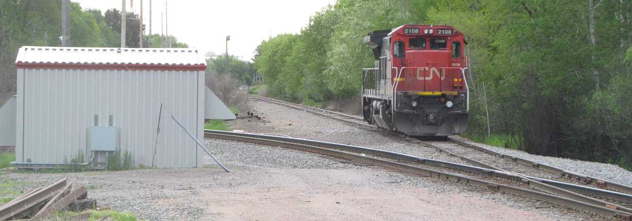 | And they come past more waiting power as they approach the diamond. (the main yard is in the trees on the upper right, there's a glimpse of a red nose of a CN and some white hoppers) |
