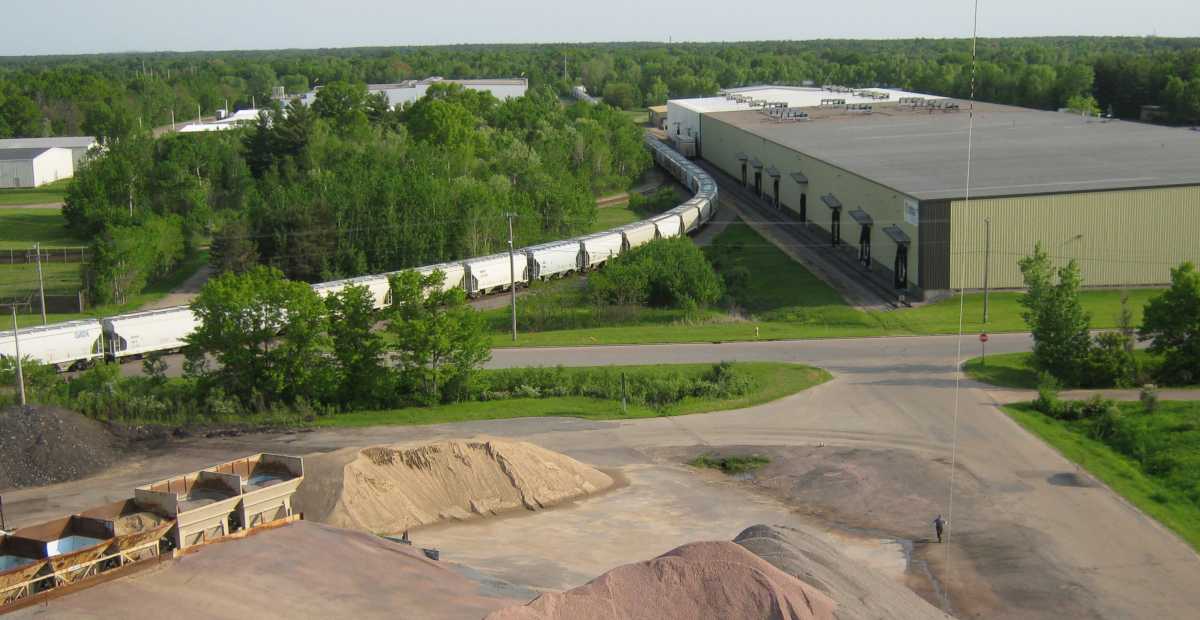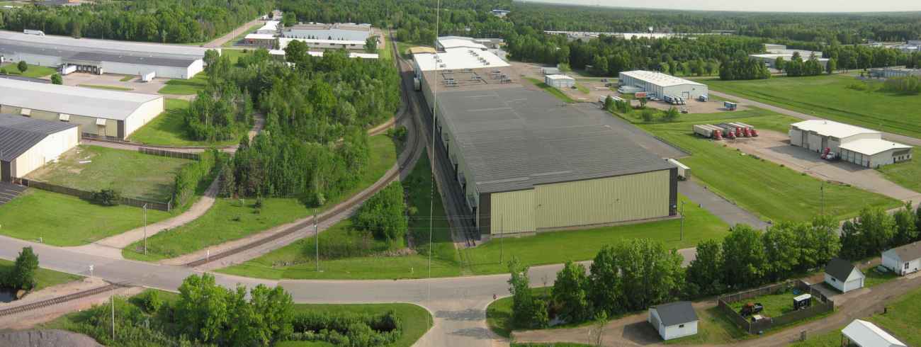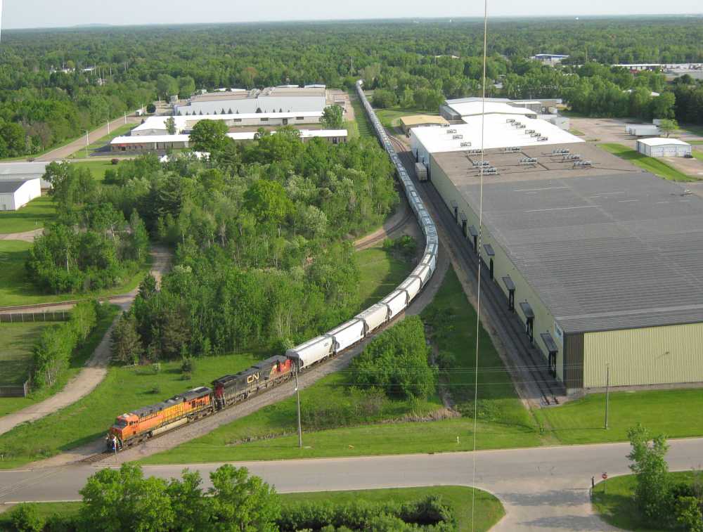 This is an aerial view of the Industrial Park, looking south. It's a little distorted, its a stitched panoramic view. Engel Road is in the foreground. 25th Avenue is in the trees in the distance. WOW, Warehousing of Wisconsin paper storage is on the left, WOW refrigerated storage is on the right of the main track. (please pardon the white kite string in the pictures) |