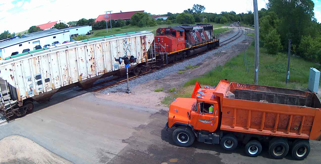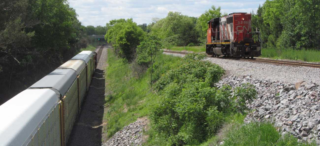 | And they have no empties, so they head back west. A westbound auto rack train is racing by on the main. |