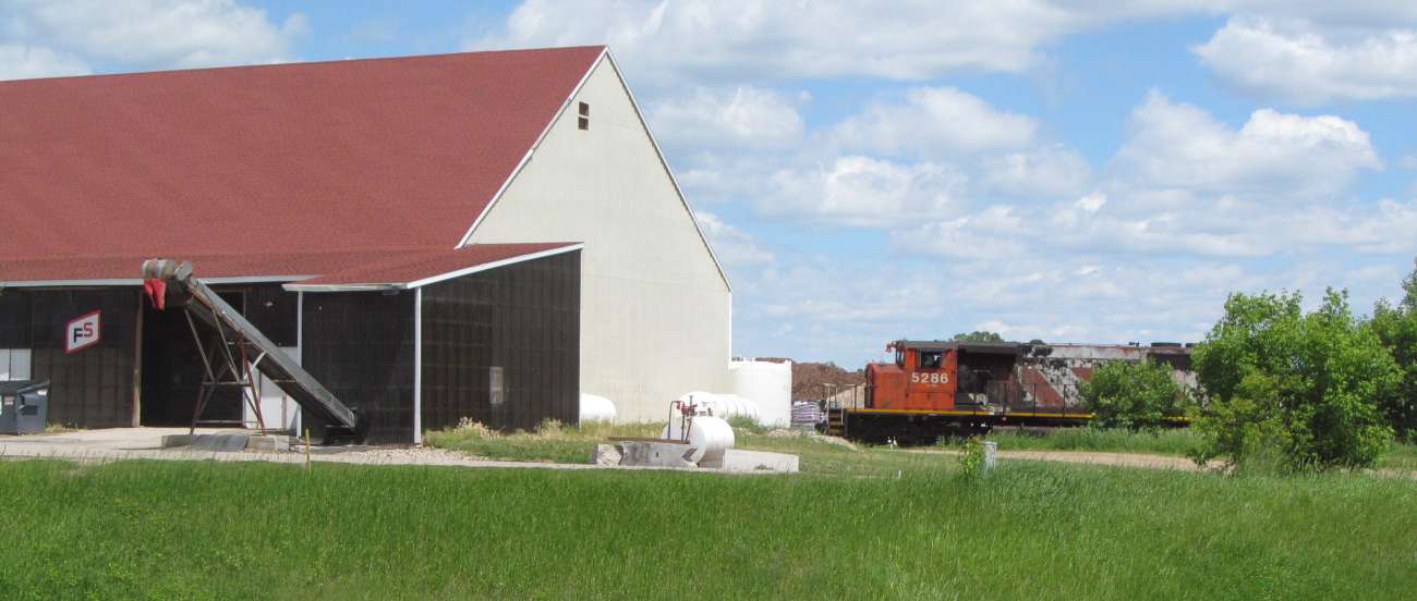 | The locomotive moves behind the Insight / Farm Services fertilizer plant. |