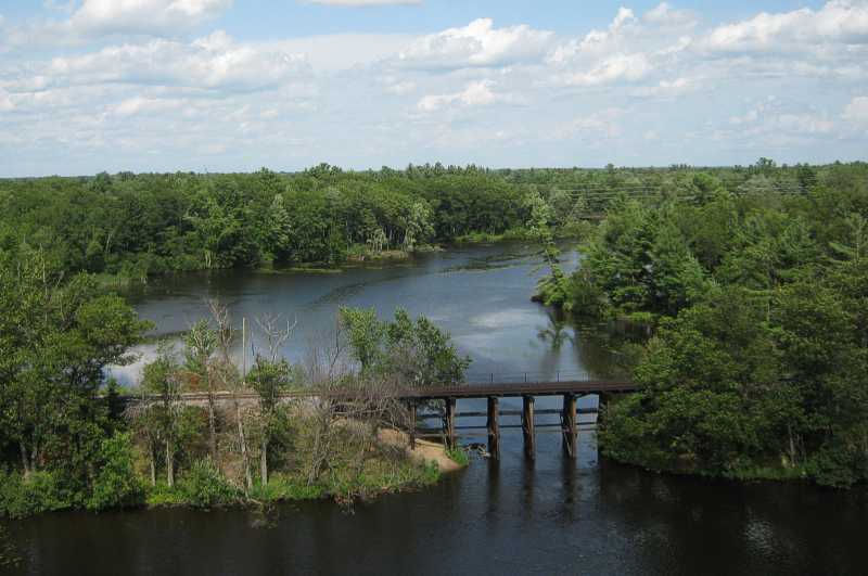 Below is an aerial view of the area of my subject. Not much to look at this time, the train didn't come through. I can almost see the 'Green Trail' in the distance on the far side of the water. So there's two railroad tracks in this scene, the active one up close, and the Trail which was abandoned and routed to the near track, 50 years ago.