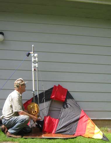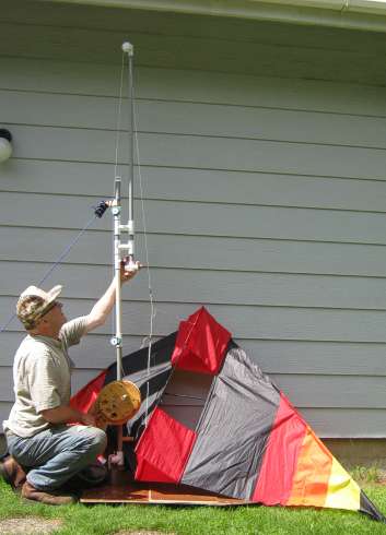 After I did the trip shown above, I improved the mast so I gain 3 more feet of height to help launch the kite. In its low position, I can reach the pulley and put the string on it. Then I raise the 'periscope' and lock it in position, then hoist the kite up to that higher level, and wait for the wind. The next three pictures demonstrate the 'periscope' that slides up. Don't expect me to show a picture or video of this launch method, I am busy enough just getting a launch without also getting pictures of it. This method might also apply to other difficult places to launch a kite, such as, from a wheelchair. |