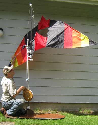 I first hang the kite from the top of the mast, and then I motor or row around to find a place where a puff of wind might come down to water level and make the kite start flying. That might take 15 minutes.