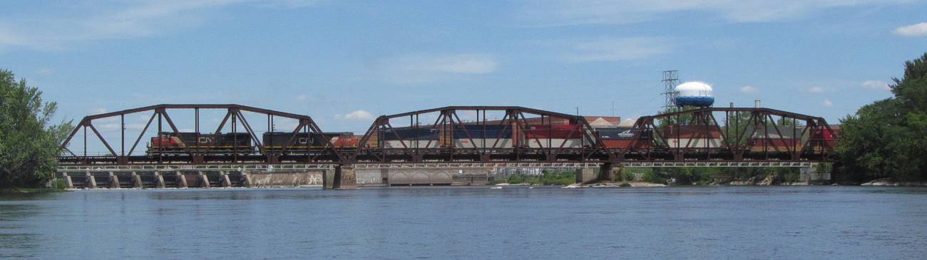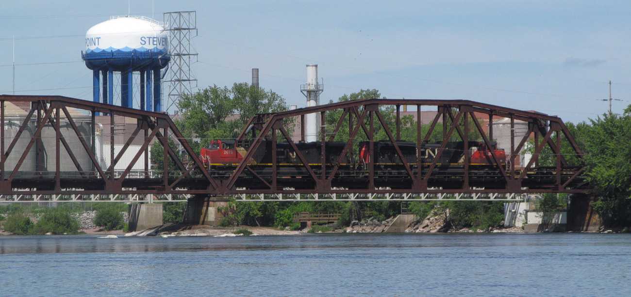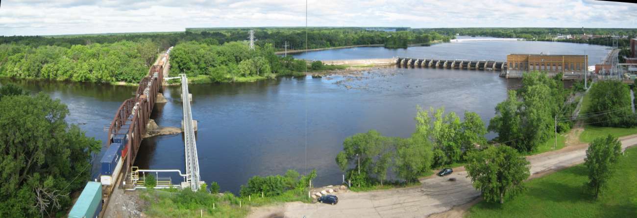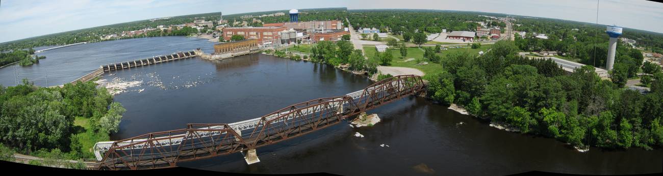 This is a kite aerial panoramic view, and the stitch is not perfect because the bridge steel didn't line up. In real life, the bridge is straight. The view is a quarter of the compass, looking from North to East. In the distance is the Stevens Point Division of the paper mill, and then Vetters, and out of sight is the depot and rail yard. At the right of the view, see the kite string and follow it down to my little boat by the shore. |