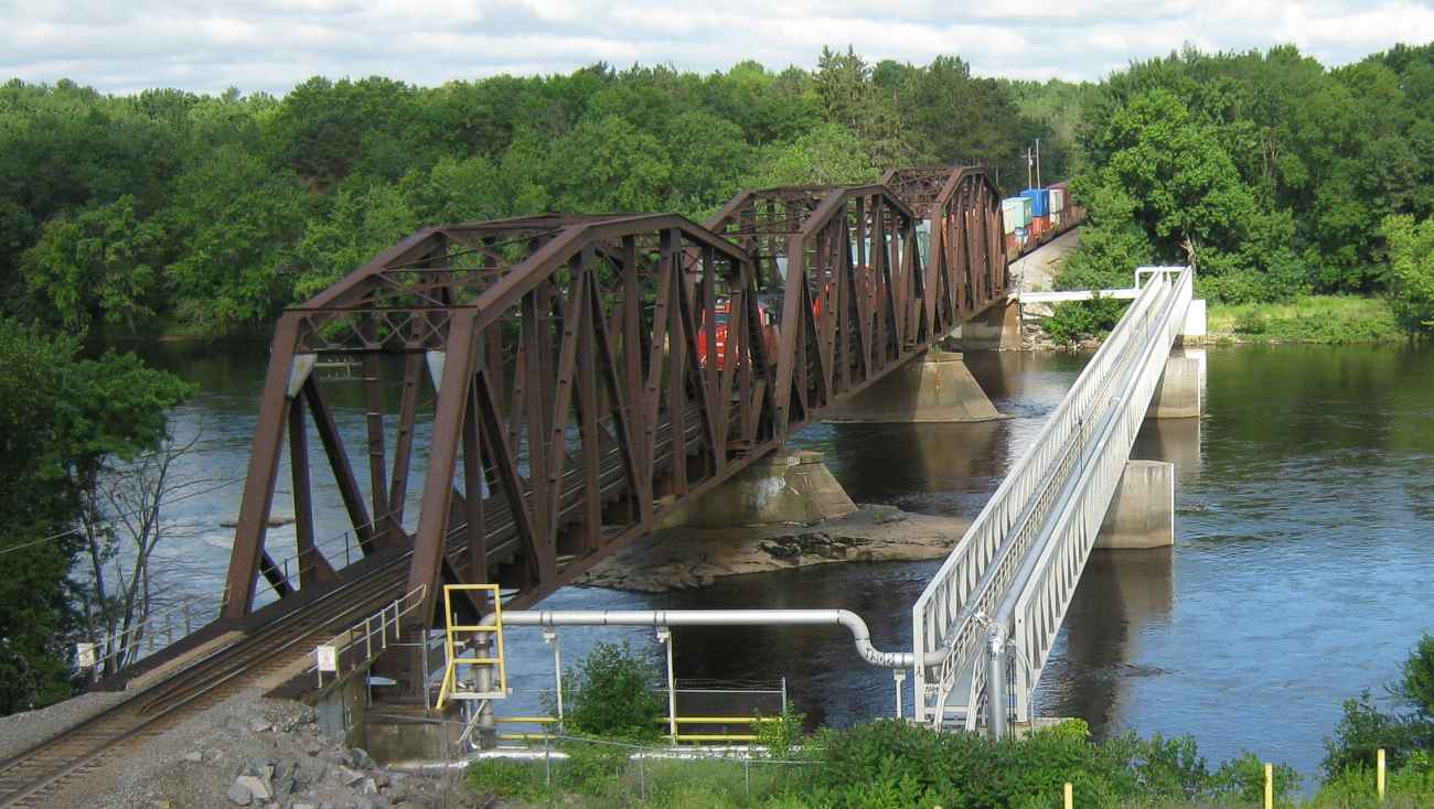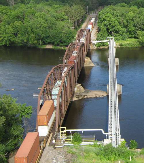 The silver bridge is for city water pipes. Those pipes used to be under the Black Bridge, but vibration from the trains was cracking them. There is not a public walkway on the pipe bridge. Sometimes, kids still walk the Black Bridge |