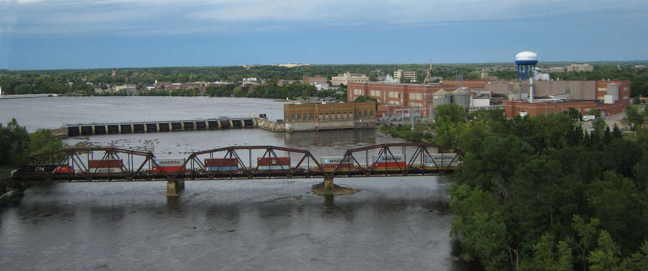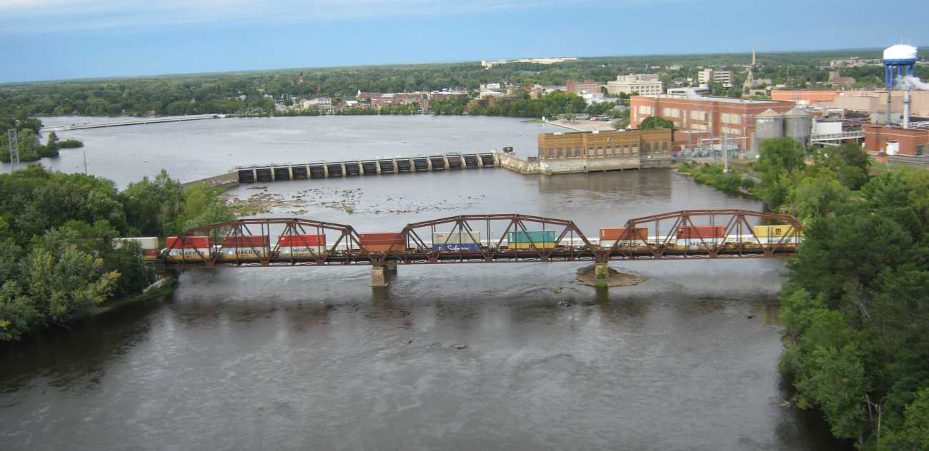Stevens Point, Wisconsin; September, 2019. The last time I was on the Wisconsin River, I didn't get an aerial view of a train actually crossing the Black Bridge. And, from water level, the bridge has a lot of steel that hides some of the train. This time, I had a camera ready under the kite, and got lucky to get some pictures of this eastbound train.
