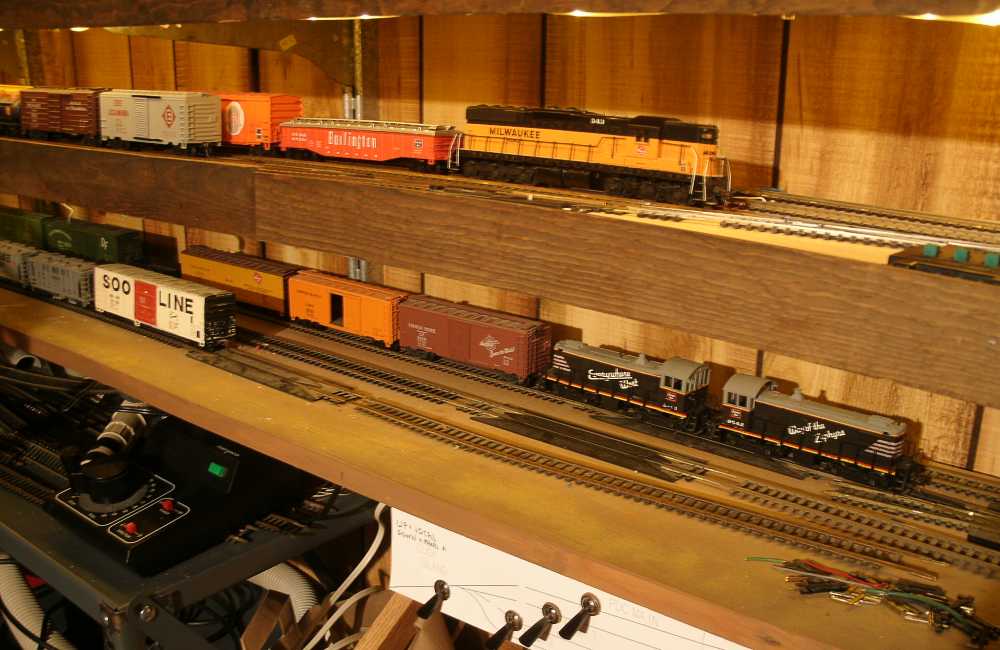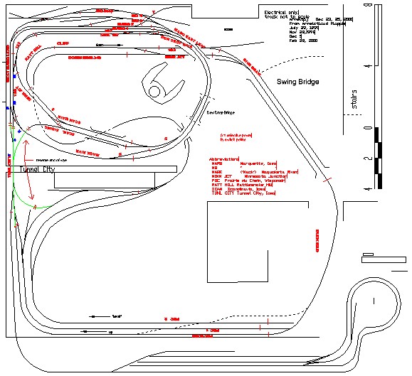 December, 2019. My current model railroad has been around for 21 years. It hasn't been shown on a public tour in 20 years; I don't have much scenery to look at, and I have to clean up my storage shelves before presenting it again. It's easier to clean up my photos than to clean up the room. I finally 'graded' a new line into 'Minnesota', in model form. I had most of the lumber from years ago, bits and pieces and leftovers stored in the garage. I did buy two new 1x 3's to make some ledges to connect existing shelves, for a total of $2.86 of new wood. Here's the track plan from the year 2000. It's in the end of a basement, and there is a dividing wall that has a tunnel through it, named Tunnel City. The new addition is on the bottom of the page, and it's actually stacked on a shelf above a lower level. |