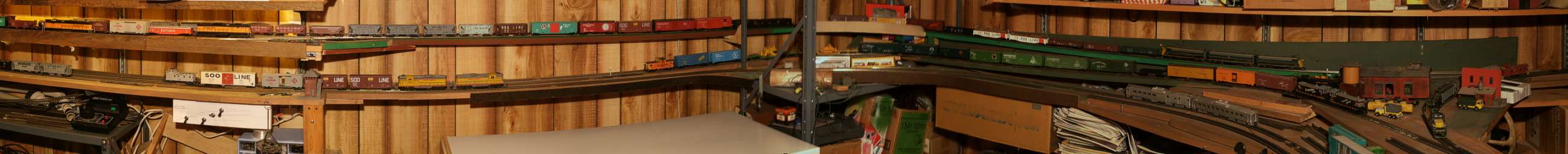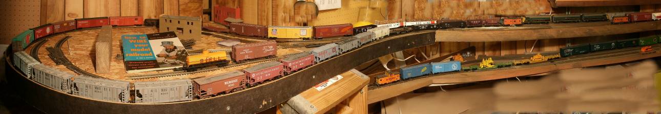 This is the left end of the loop. It dodges around plumbing and shelves and house utilities. To squeeze it in, some of the loop has a short piece of (tighter than normal) 15 inch radius track (this is HO scale). I am still using up track that I had from 40 years ago. Some of it came from a used track sale from a model railroad club that stripped out all their brass track so they could start over in Nickel Silver. I even have some really old fiber-tie track, the kind that is moisture sensitive and can change its gauge. I have to crimp my rail joiners extra tight so they bite into my old brass. |