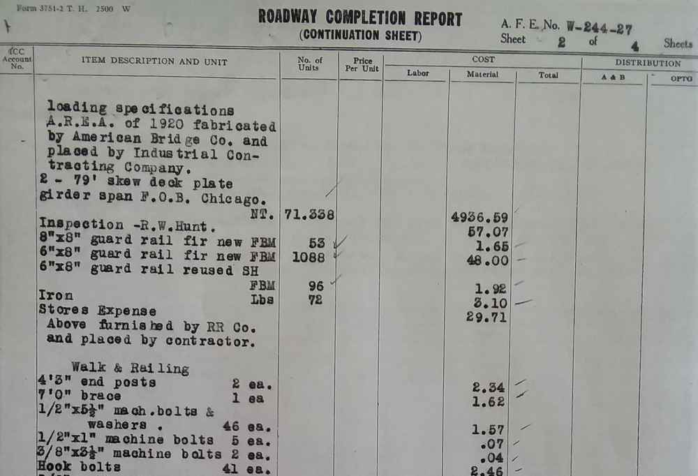 Once in a while, someone writes a note that I wouldn't expect on an accounting report. Like, the ICC report with a measurement from the bridge to the water level. I had made my scale drawing of the bridge a month earlier, using other information. And then I measured my drawing and compared it with the hand written note, and found that I was within a half foot of the same measurement. That makes a good double check of some bridge abutments that have been hidden, partially underwater, since about 1923. |