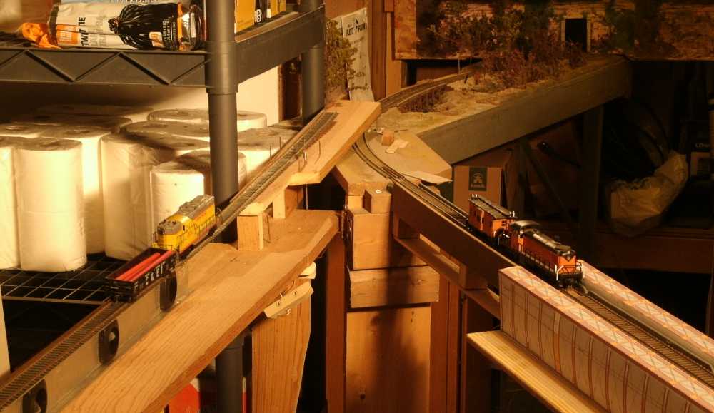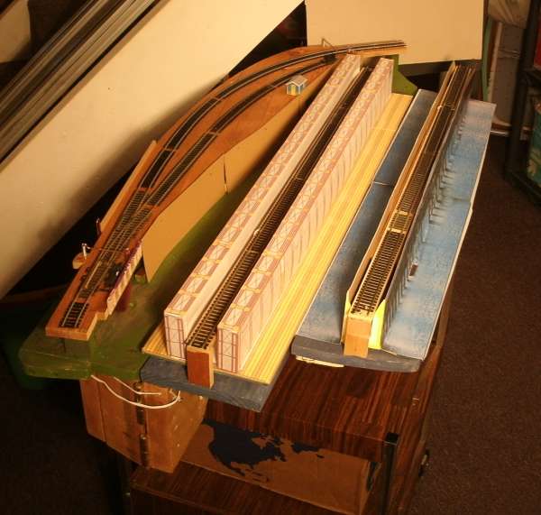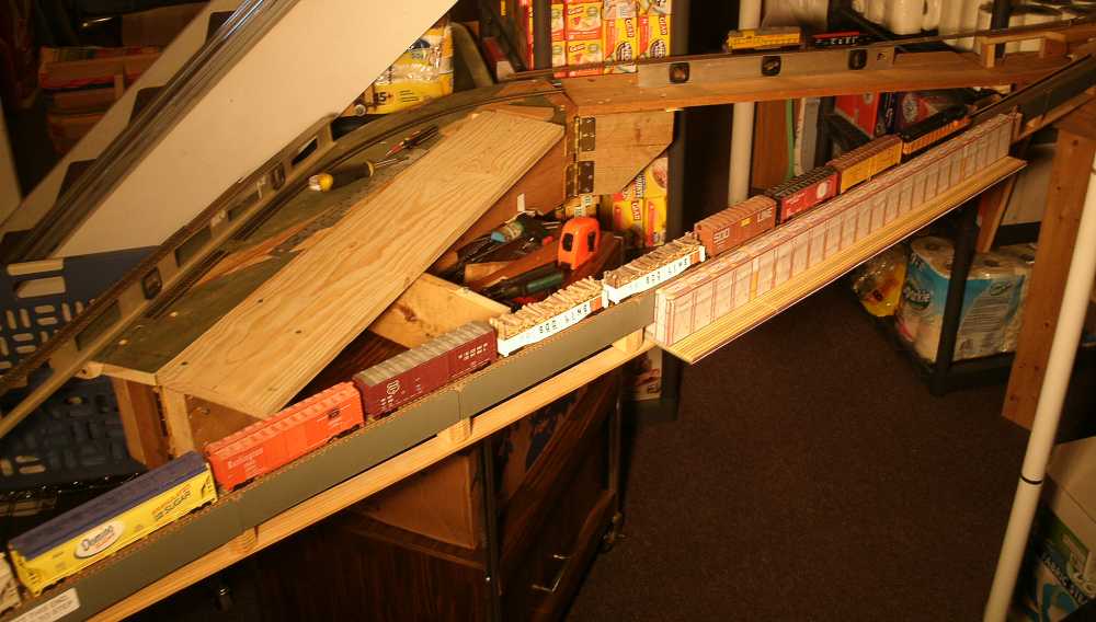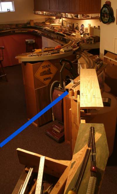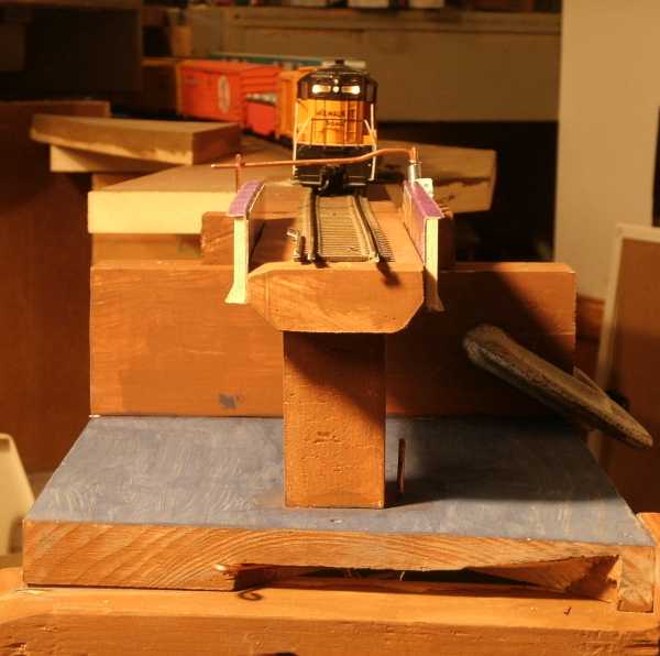 My original 'bridge' was a wood 2 x 2 x 8 feet long, just a quick way to get across the room. That's the track with a long train in the foreground. |