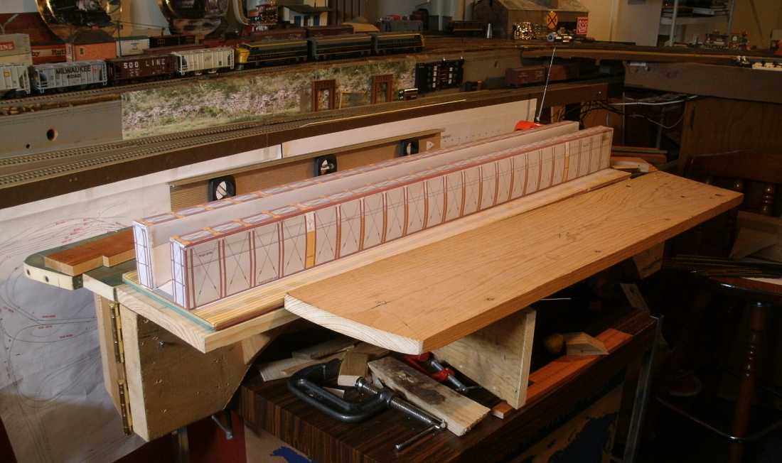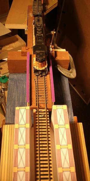 I made some plate girder bridges from cardboard boxes and strip wood. It's just high enough to keep any derailed cars from landing on the floor. Needs some paint. One side is cardboard, the other side shows Girl Scout cookies. (I need more cardboard, please send cookies.) The prototype had lots of vertical wood piling under their girder and truss bridges, and I still have to add some 'decorative' piling to simulate that. |