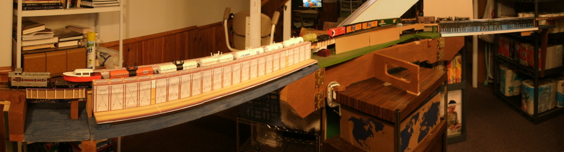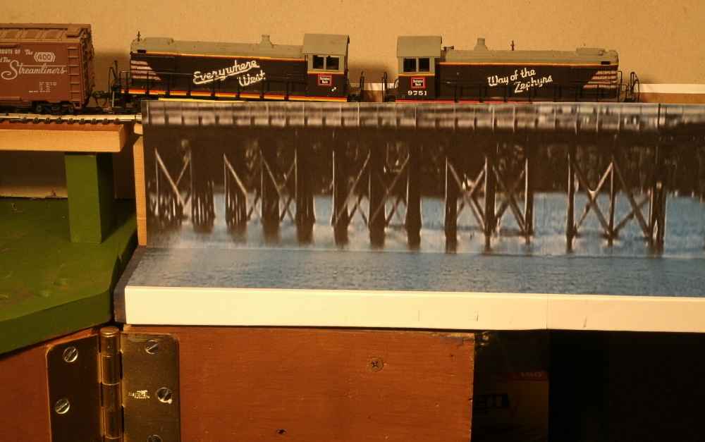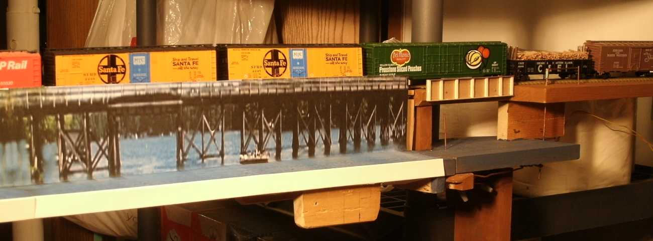 The Burlington has trackage rights on my railroad. The 'temporary' paper mock up is a trestle picture from Minocqua, Wisconsin, stretched vertically from its original 14 feet tall to now be 21 feet high to fit this location. The Milwaukee Road sometimes floated the pontoons out for the winter when barge season ended, and pounded in a temporary wood trestle. I am doing something similar, using a picture, until I build another pontoon for the west channel, and then float the west channel paper mockup pontoon to this east channel. |