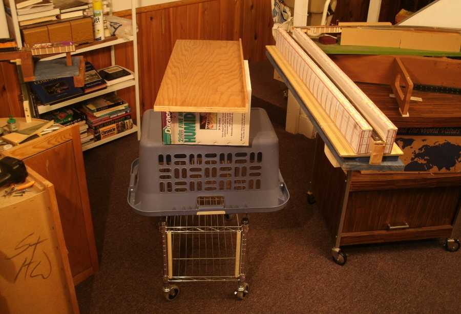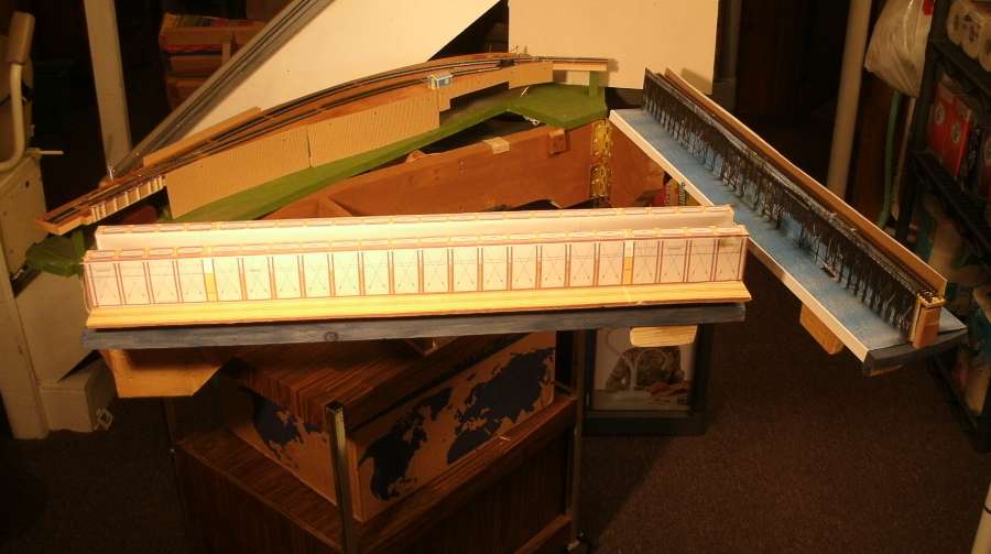 The new bridge and its support 'island' was built 10 feet away from the actual site, in my 'construction yard'. I 'floated' the original bridge into this new use. Sort of like how the real ones were moved. My assembly is built on top of a 30-year old appliance cart with 4 caster wheels. I could imagine it will be floated up the river to the new site, but actually it will be rolled. The entire thing is 22 inches wide and I can roll it anywhere to get it out of the way of other things that are stored in the basement. So, not only do I have two draw bridges to have quick access to 2 aisles, I can also roll the entire set of bridges and their island completely out of the room. Never mind that in the real world, the island was a mile wide. |