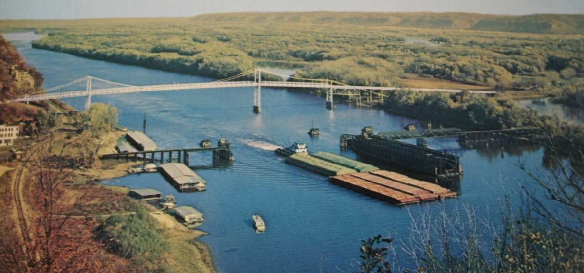 I have made a web page about one bridge before, but now I actually built more and my use is getting more accurate to the protoype. Historically, there were two of these floating pontoon swing bridges to get across the Mississippi River, one at the west channel by Marquette, Iowa, and one by the east channel near Prairie du Chien, Wisconsin. (The other Milwaukee Road pontoon draw bridges were just 'singles', at Read Landing, Minn., and at Chamberlain, South Dakota.)