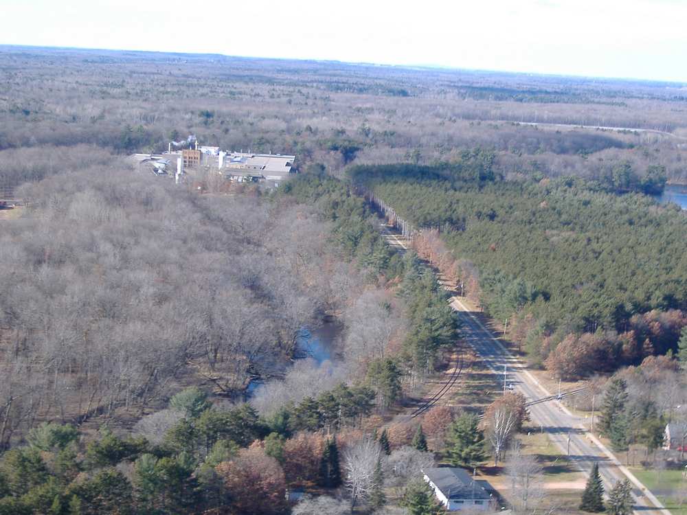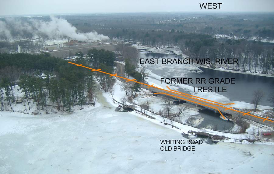 Many years ago, the original Wisconsin Central had a rail spur into the plant from the north. My father-in-law remembered the track. There was a trestle over the mouth of the Plover River, where it enters the Wisconsin River. In the springtime high water, they would park gondolas of rock on the trestle every night to hold it down so the ties wouldn't float off the bents. This was about in the 1950's. I don't know when the trestle was removed. The pilings were sawed off at the waterline, and some still show. About ten years ago, Old Whiting Road was re-aligned and a new concrete bridge was built directly over the location of the trestle. The road is also a dam of the Plover River. A water power canal goes south past the parking lot, I don't know if its actually used any more. I marked the photo below with the information. |