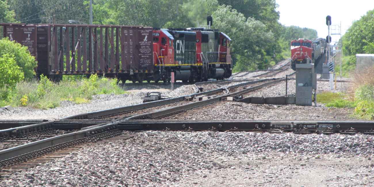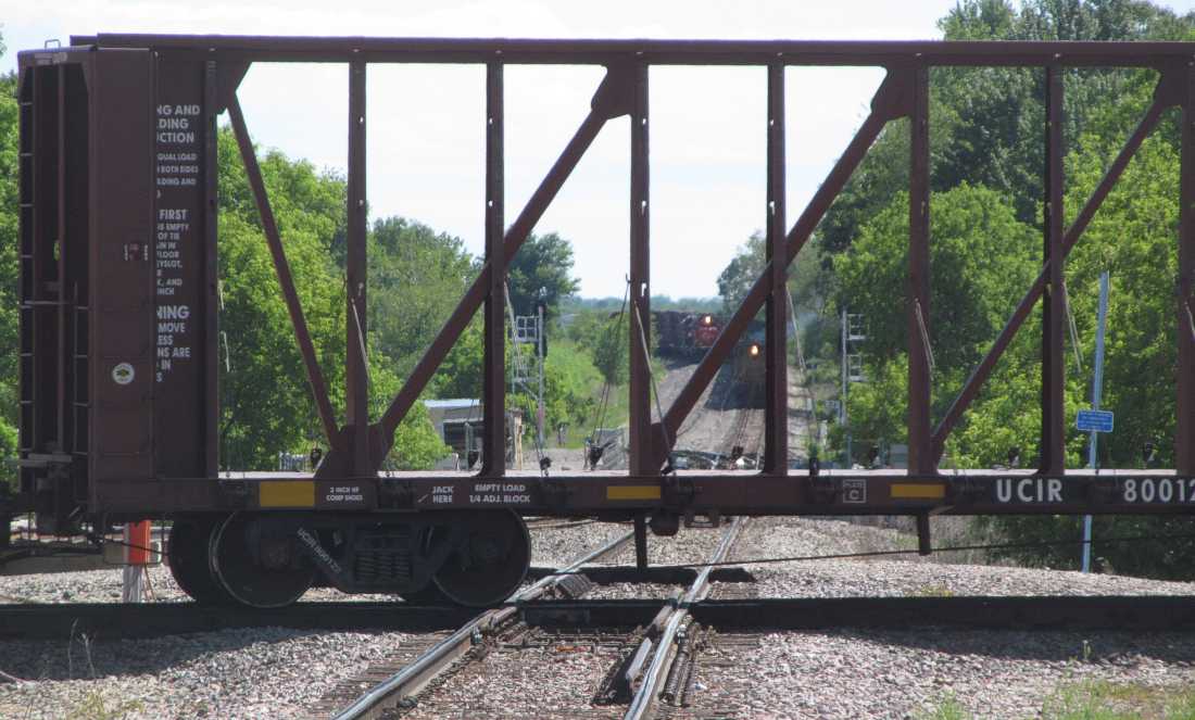 At the diamond, a west bound train has a lot of empty centerbeams. In the distance, the rear end of the southbound coal train is on the right; they got that far and then had to wait. On the left is the headlight of a train that just came from Wisconsin Rapids. |