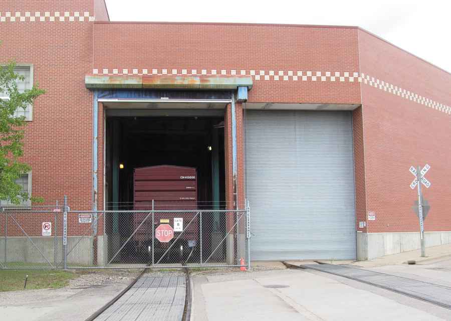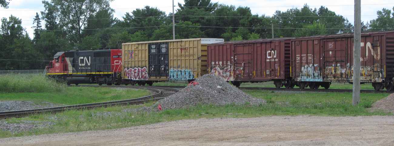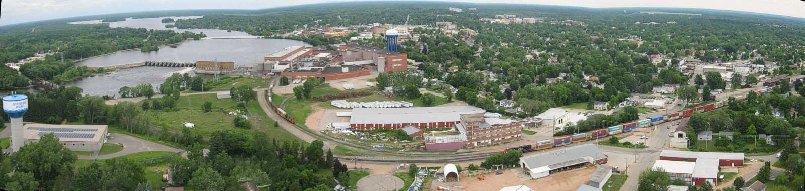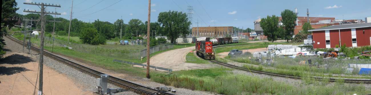 I watched the Plover job work the Stevens Point Paper Mill, something they do every day. The cars are sorted in Plover and then taken to here. The mill is on the horizon, around the curve of the Vetter spur. The red building and Vetter is occupied by a company called Corex, which doesn't get rail service and is not directly related to the paper mill. This view is a panoramic and from a 30 foot pole. From the ground, I could barely see over the main line track. |