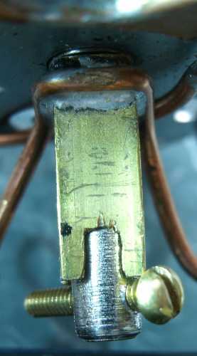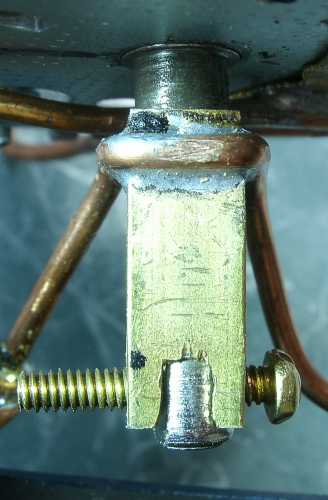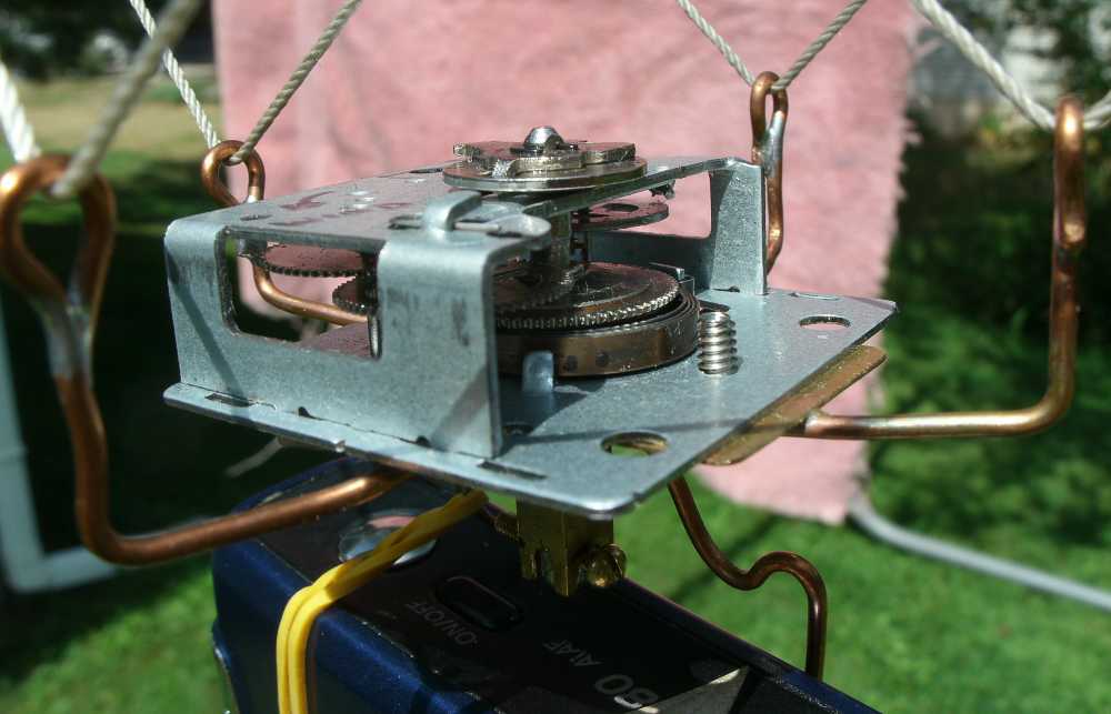 The camera is hung by a 2-wires soldered to a square tube. The tube slides over the shaft of the clock. I cut 4 notches in the square tube, so I can raise the tube and rotate it to a different quadrant. This lets me position the final resting place of the camera direction when the spring is all wound down and the camera stops turning. Even if the camera isn't turning, it can still get pictures. |
