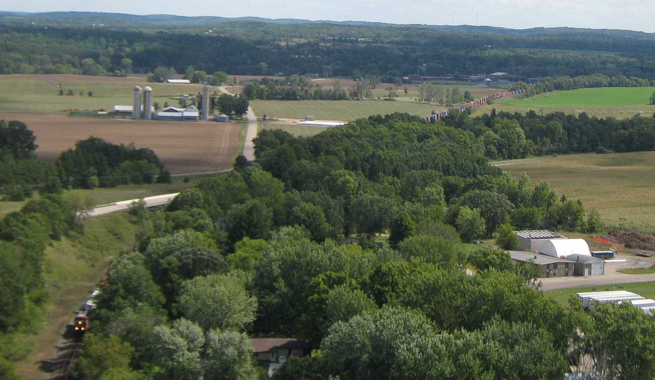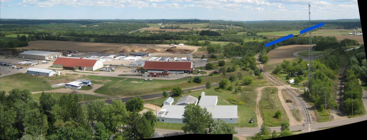 Below is a panoramic wide view of the farm service buildings at the east end of the GBW spur. Train service is as-needed, I could guess once a week by a noon local from Stevens Point. I put a blue line on the horizon to show the trail remaining; the tracks end close to the edge of town. The trail doesn't travel through town, you have to make your own connection over town roads out in those hills on the horizon. Try the Cate County Park. |