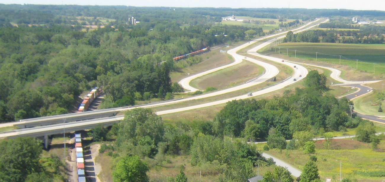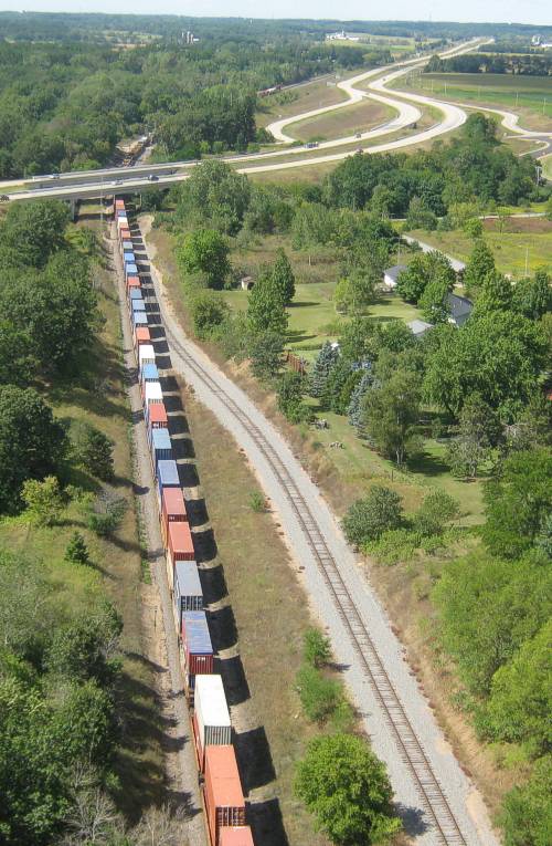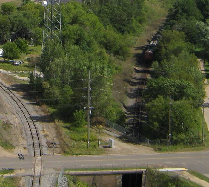 Looking southeast, a westbound train is coming. The colorful containers on the upper right are coming out of Amherst. The locomotive headlights are in the cut and partly hidden in the shadows of the trees. |