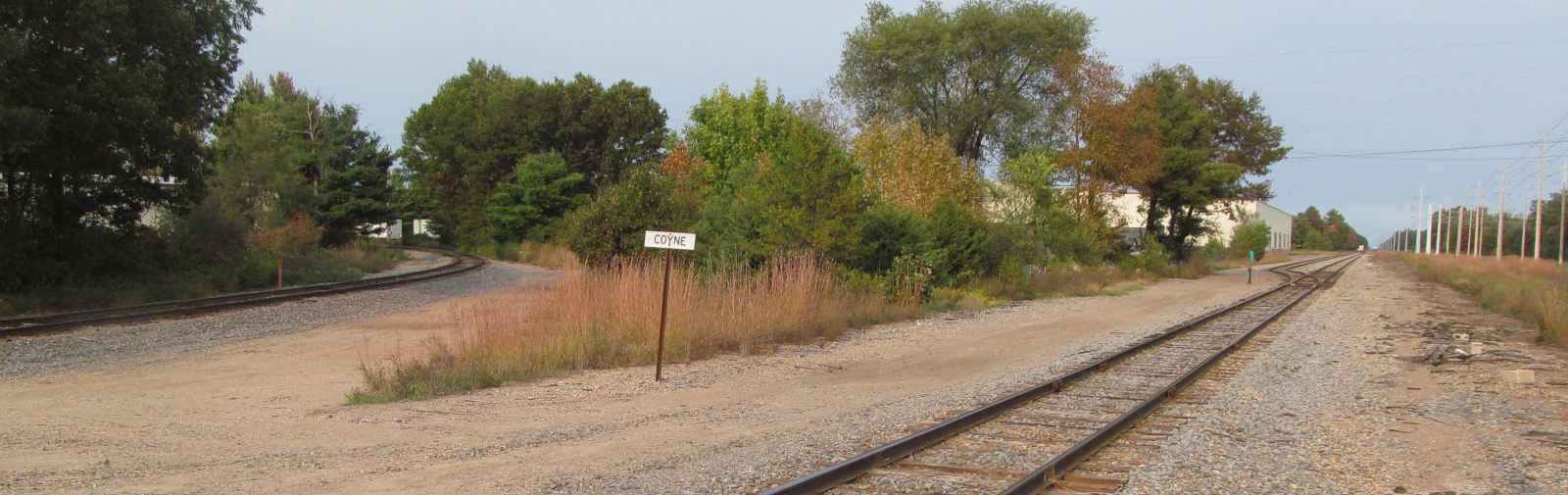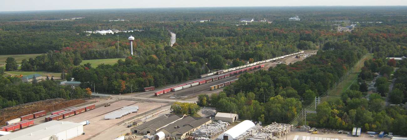 On the horizon is a row of white buildings surrounded by trees, which is part of the Rapids East Industrial Park, and the mainline tracks.