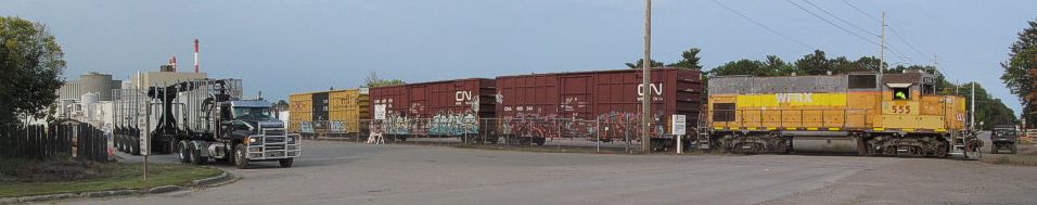 For many years, the local railroad sent a switch engine from Wisconsin Rapids to here every day. Now, a contractor does the switching. Their yellow locomotive is near a beater room. |