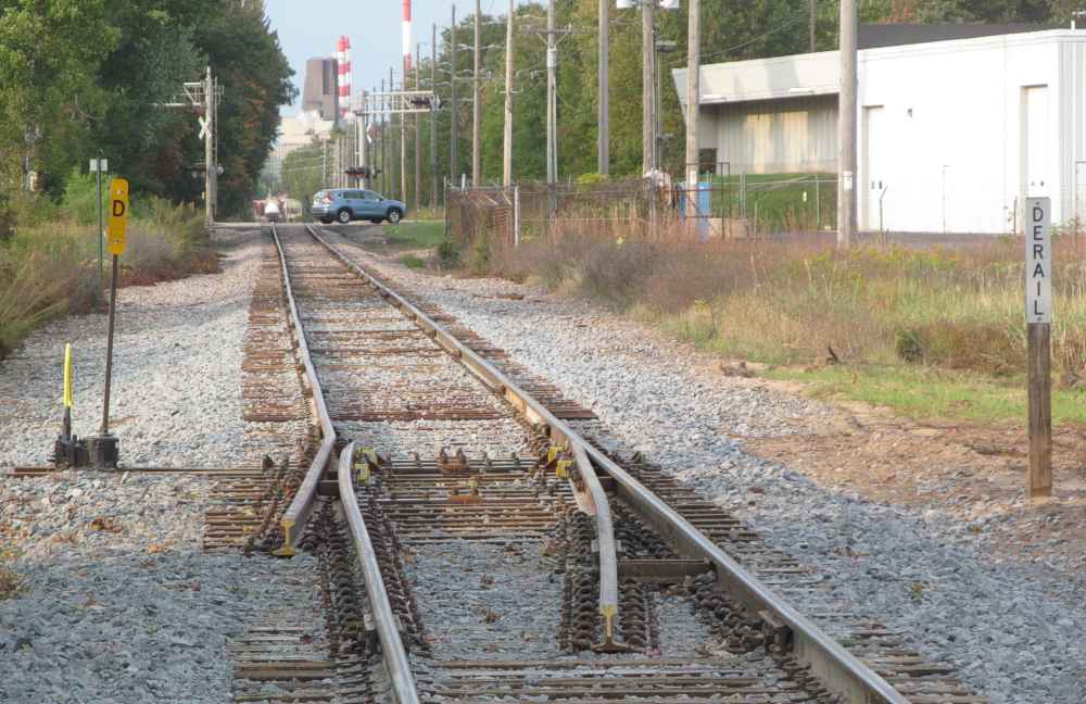 The location shown below is a mile south of the mill; see their red smoke stacks in the distance. That's State Highway 54 with a car moving. Joe reported that a derail was installed when the contractor took over the switching duties at the mill. It is a split rail (partial switch) or a 'catch points' type, not just a little wheel wedge chock derail block. |