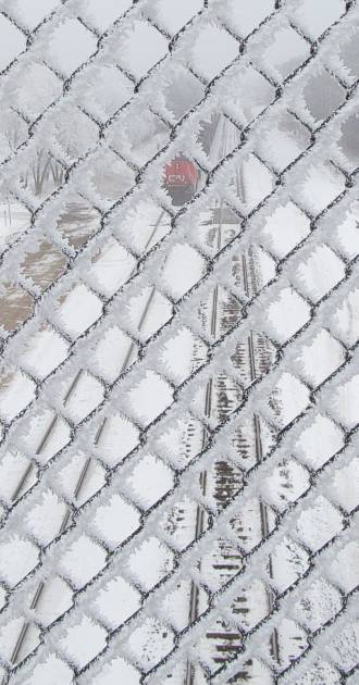The wire fence on the street overpass has been growing ice crystals