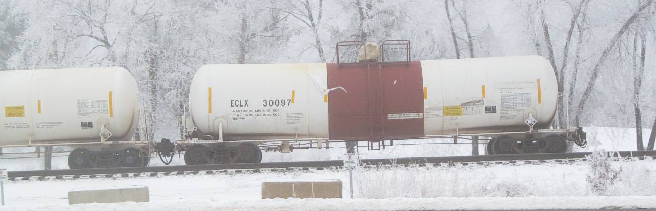 These red / white empty cars can loaded with alcohol at Necedah, too. Usually, the top cover of white cars gets a protective plastic bag on loaded cars, but this one has a bag, too. |