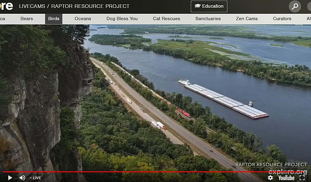Another day, a barge tow and a train are in the view. This doesn't happen every day, because often the camera is pointed elsewhere for birdwatching. And I have only seen one Amtrak all summer. There is a rail passing siding, I think its called French Island. And that's Interstate 94. |