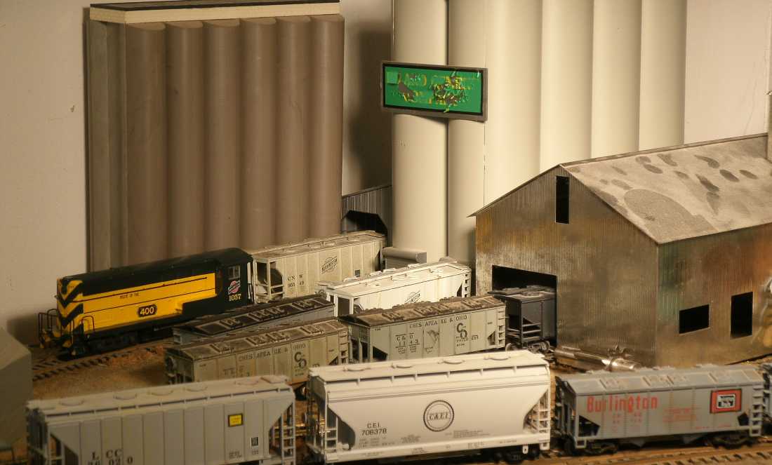 Over a dozen loaded hoppers are being pushed west, uphill, from the 3M plant,