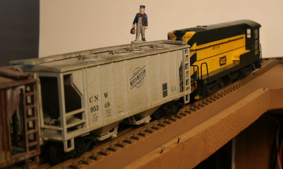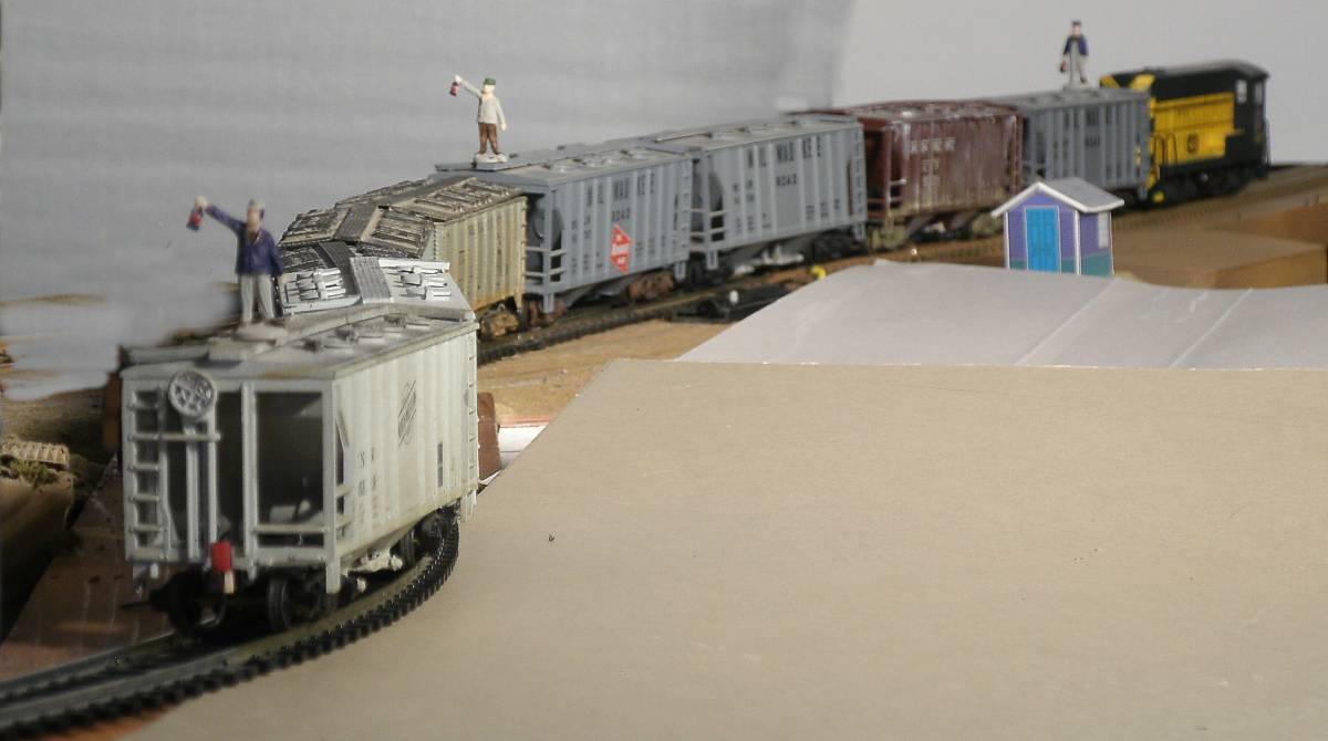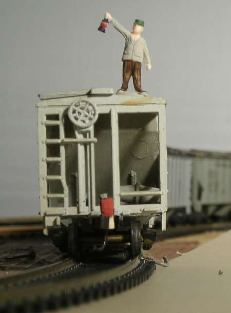 And in the middle of this is another brakeman, relaying the signal. That man in the middle is really useful when they go around curves, especially the S-curve. Remember, this is after dark, and I could see waving lanterns up there. Not like this daytime model picture. And the string of cars could be twice as long than what I modeled here. Those FM's could really push a load. |