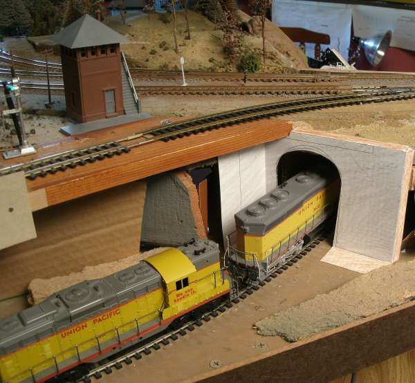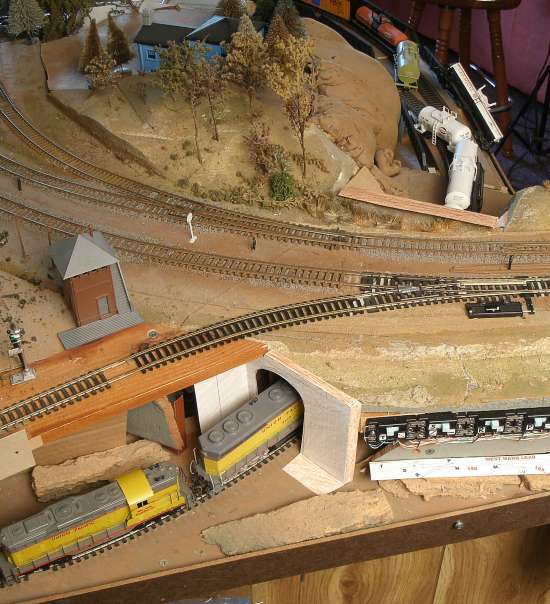 Knocked out a whole bridge girder, out of sight. One car is hanging the next girder. The Mississippi is 6 feet deep here, if I would have painted it muddy blue so you would know. |