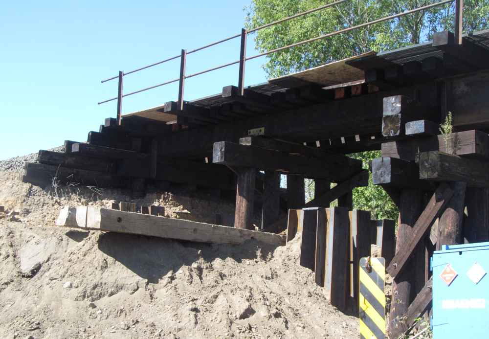 | It's mostly wood now, but notice the new steel H column pilings driven in. |