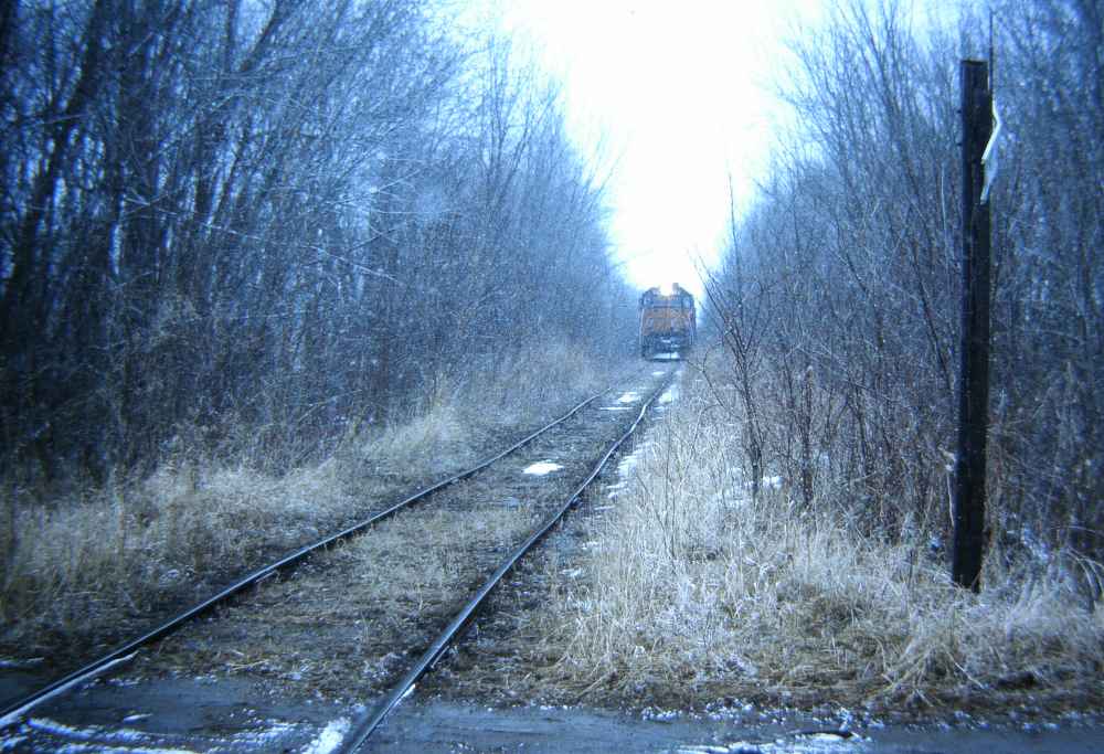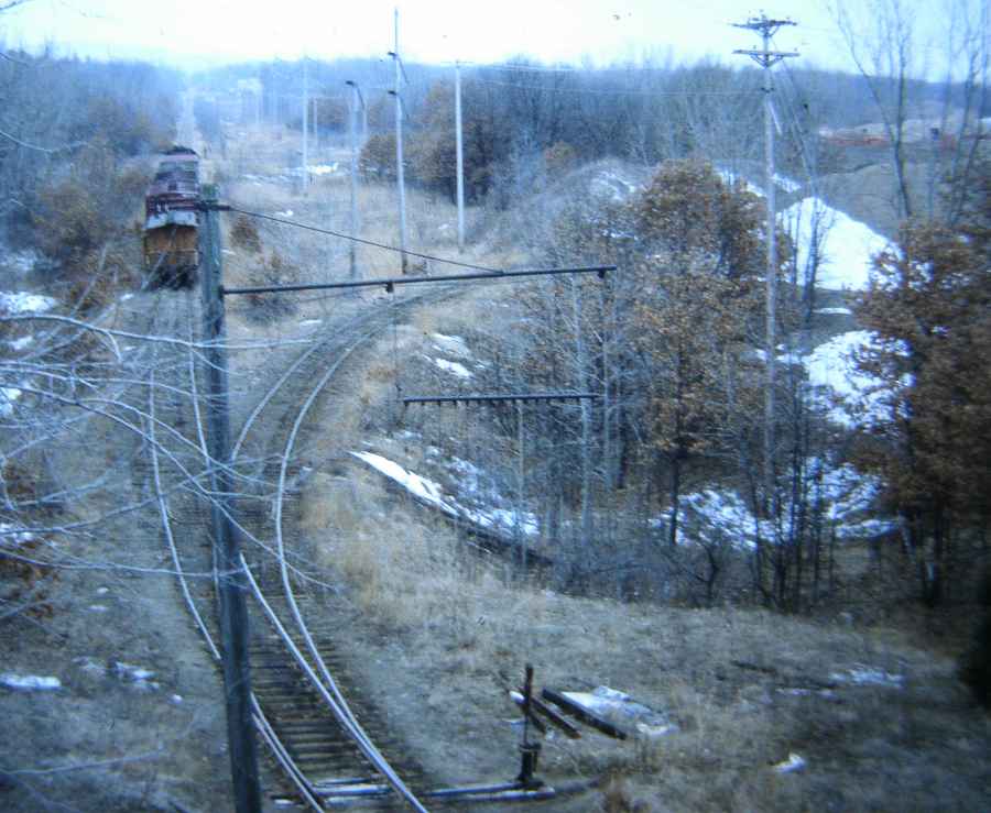 Going south past the spur to Eau Claire Materials sand and gravel plant. The Tell Tail is for northbound trainmen to duck for the US highway 12 bridge |