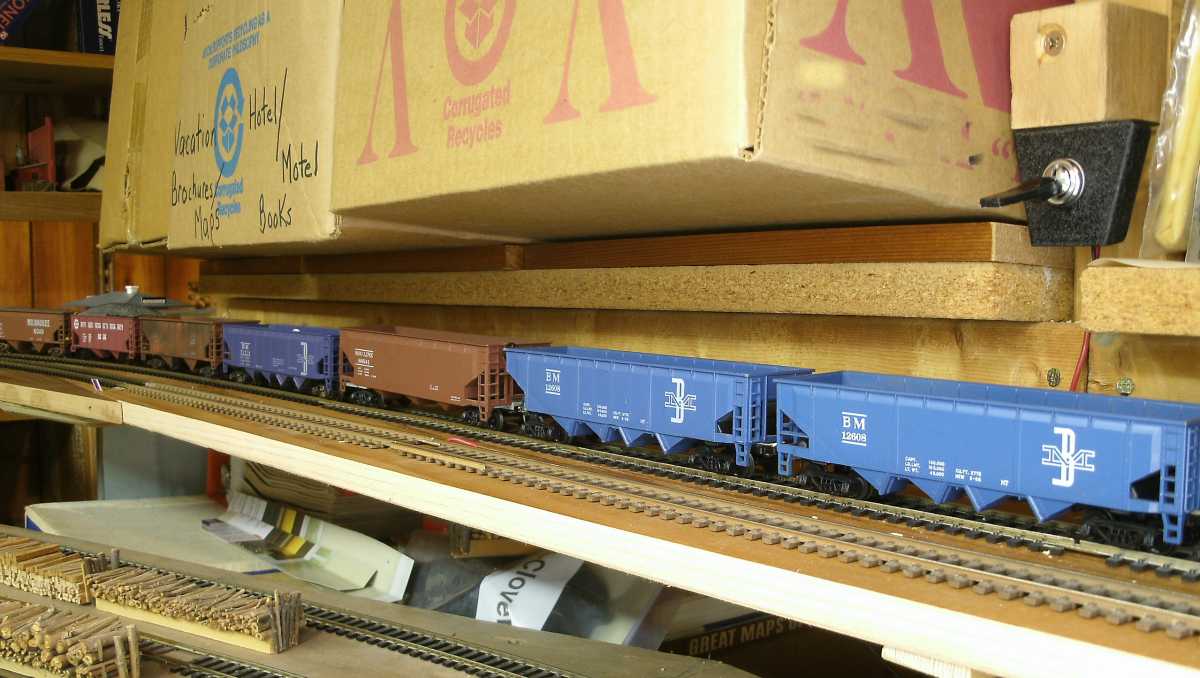 I have boxes of real books, and to get enough room under the boxes to squeeze in a train, I added 3/4-inch wood blocks to raise one end of the cardboard boxes. Not much real scenery in this area, so I use lots of imagination. Or print pictures and tape them on. I should at least spray paint the rails and ties with Rail Brown to blend it with the supporting wood. Although, it's not too bad right now because its on Cedar trim boards, just 1/2 inch thick so it saves vertical space because the tracks underneath this also need headroom. I also like the Cedar because it's soft and easy to drive nails into. |