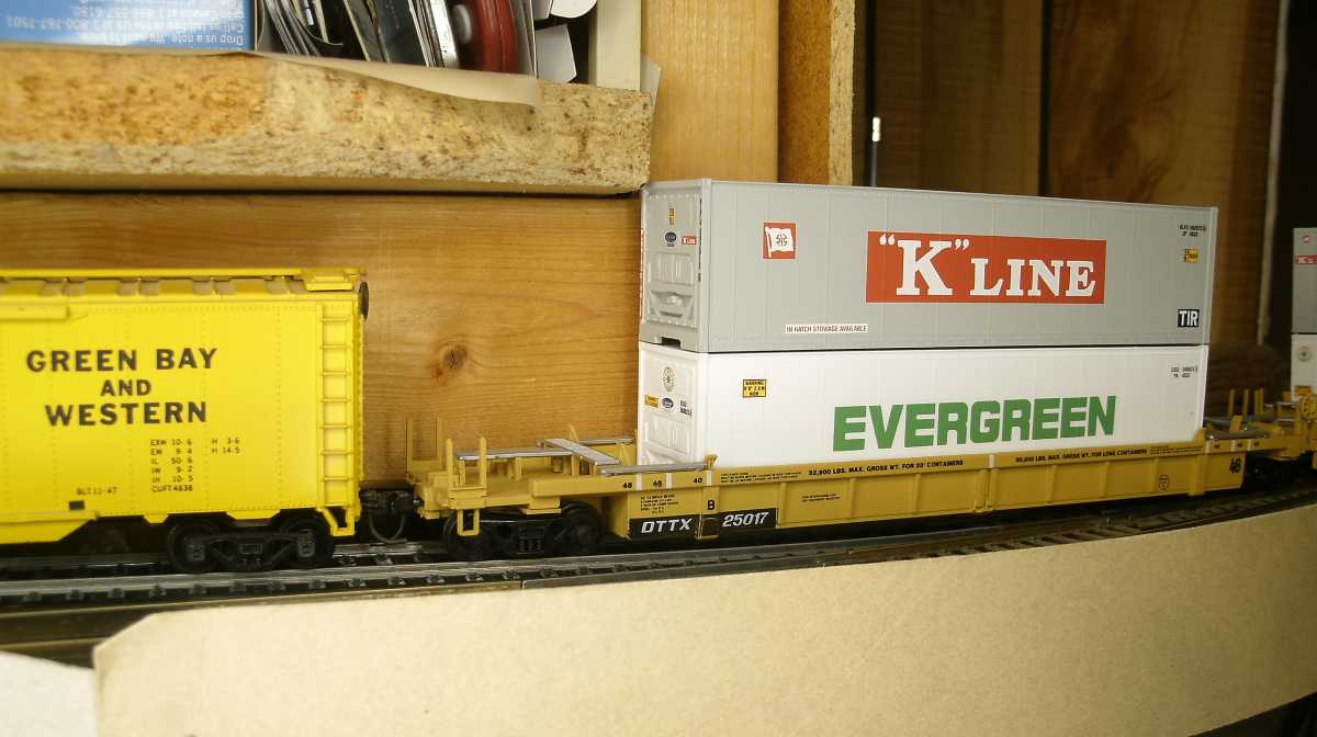 The space is low enough that hi-cube boxcars can start their journey along the siding, but will eventually wedge their tops under the shelf And double stack containers will clunk on the wooden edge, so they are Not Allowed in Siding |