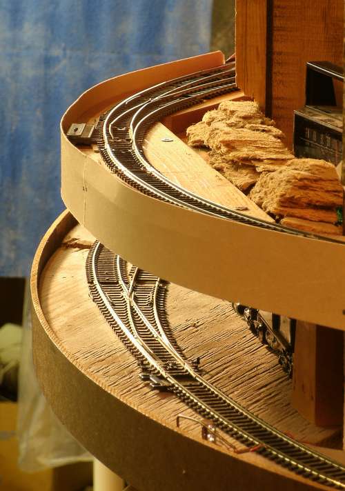 I moved the main line to the left edge of the board, which is only 3-1/2 inches wide. And a siding was sqeezed next to the cliff side. Definitely a place for a sign: . . 'No room for man riding side of car' |