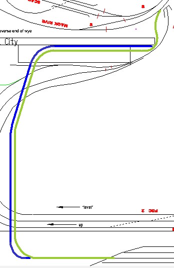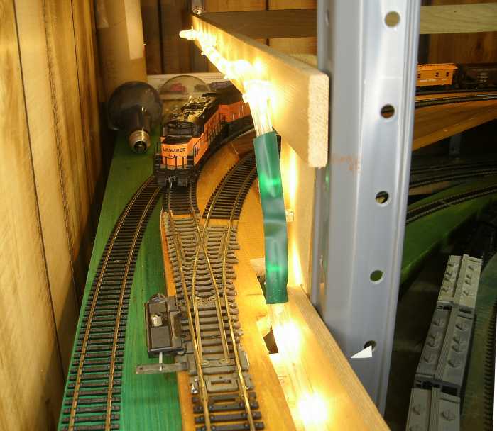 The top end of the siding is squeezed behind a shelf leg and lighting valence, like several other tracks under it. I put a dependable Atlas No. 4 turnout here, because it's hard to see and reach this area. and I didn't have another dependable curved switch to make this more streamlined. The track on the green board looks like it might go to a switch under the locomotive, but actually it's an illusion in this view, it is 3 inches below. The right side of the locomotive has track hanging in the air by a 1/4 inch over the edge of the board. With no support board under the track there, there is more headroom for trains below. |
