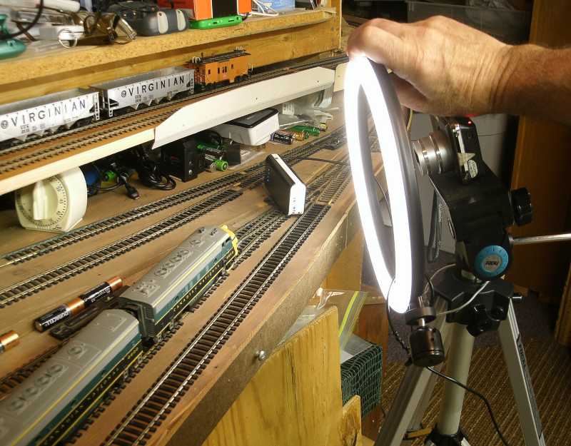 I got a ring light last week, a $10 wonder on clearance sale at a discount store. Since than, I have seen similar ones in re-sale shops for $4, but mine came with tall swing arm to support it. But actually, I just like to hand hold it where I need the light. It shines light very evenly, and avoids shadows, especially on those black trucks under the cars. The ring light is made to provide even lighting for selfies. On the model railroad, I find that its effective range is about 2 feet. It is powered by the 5 volts of a USB port, or a battery pack which makes it very portable. I put the camera on a tripod, and hand hold the ring |
